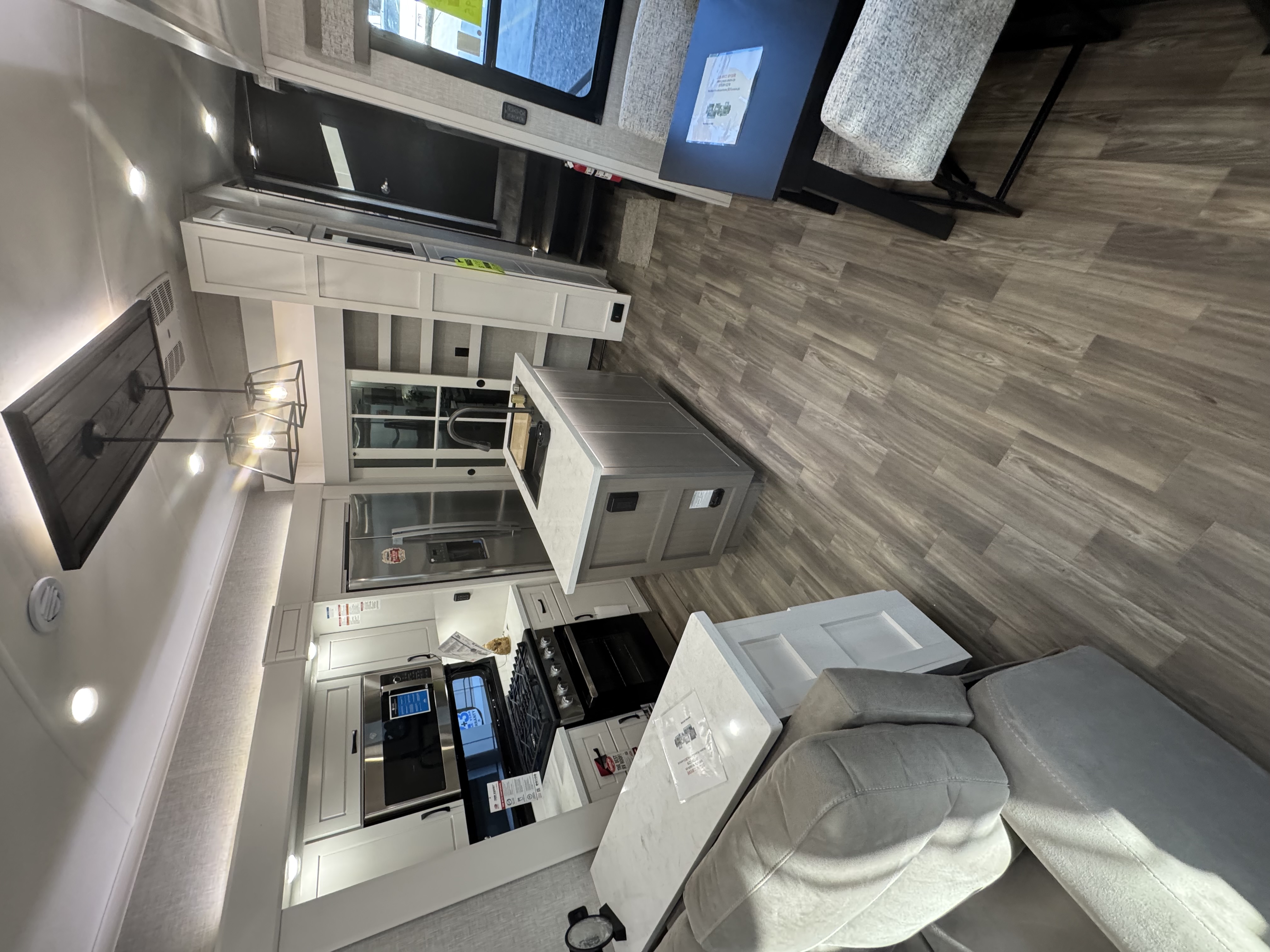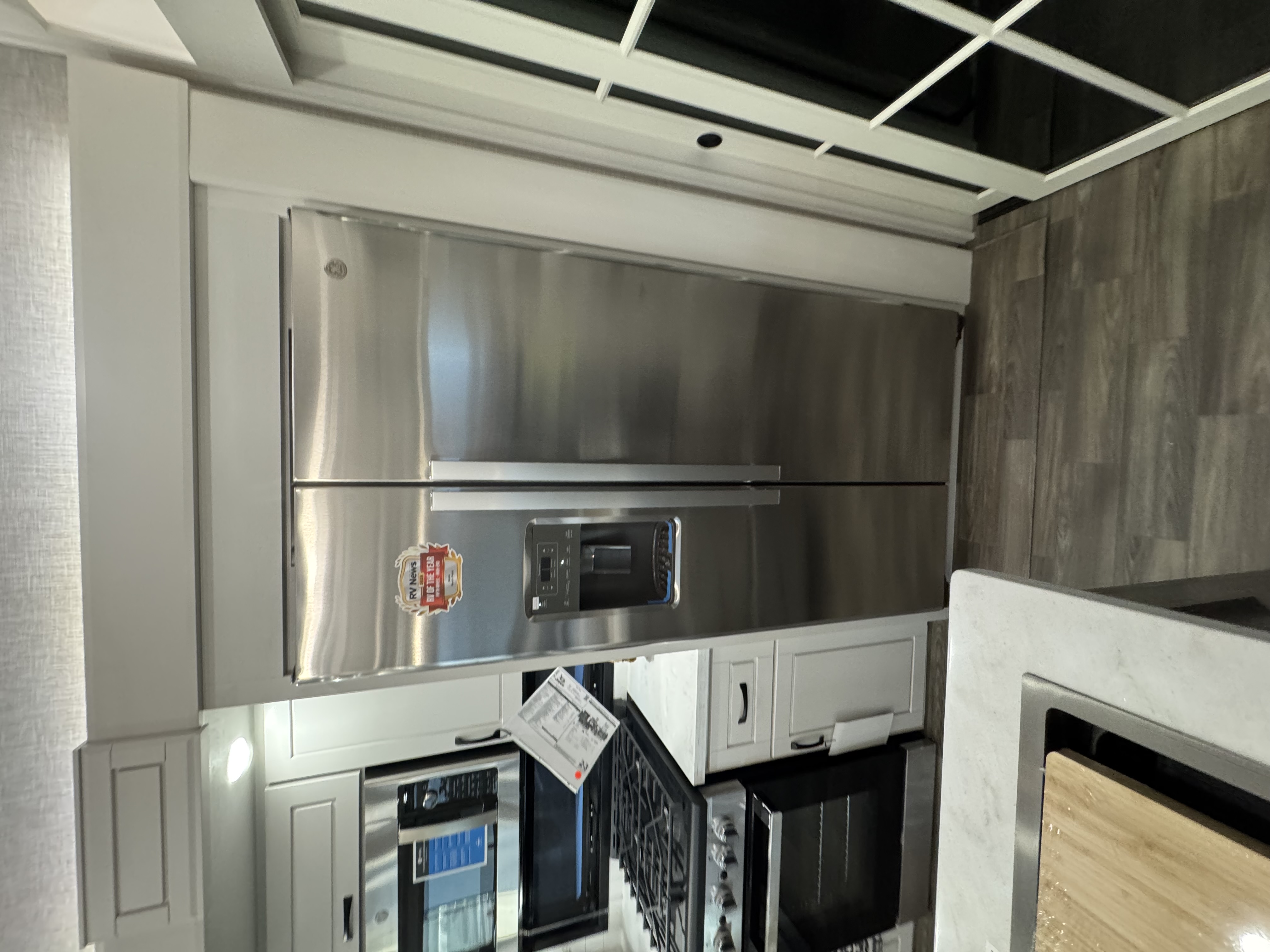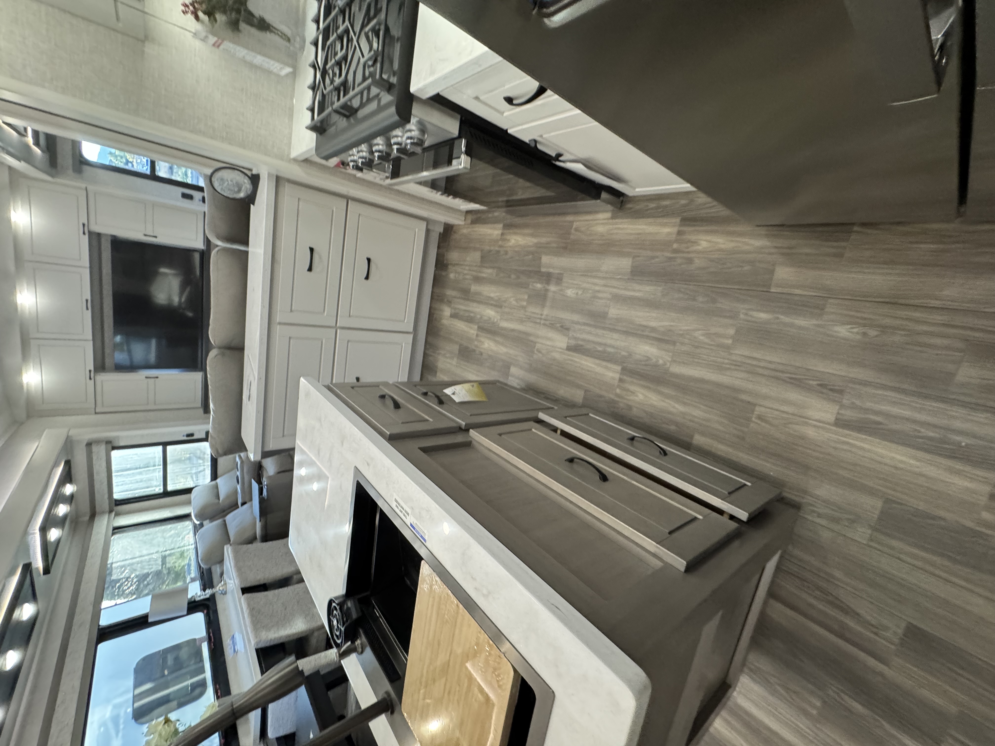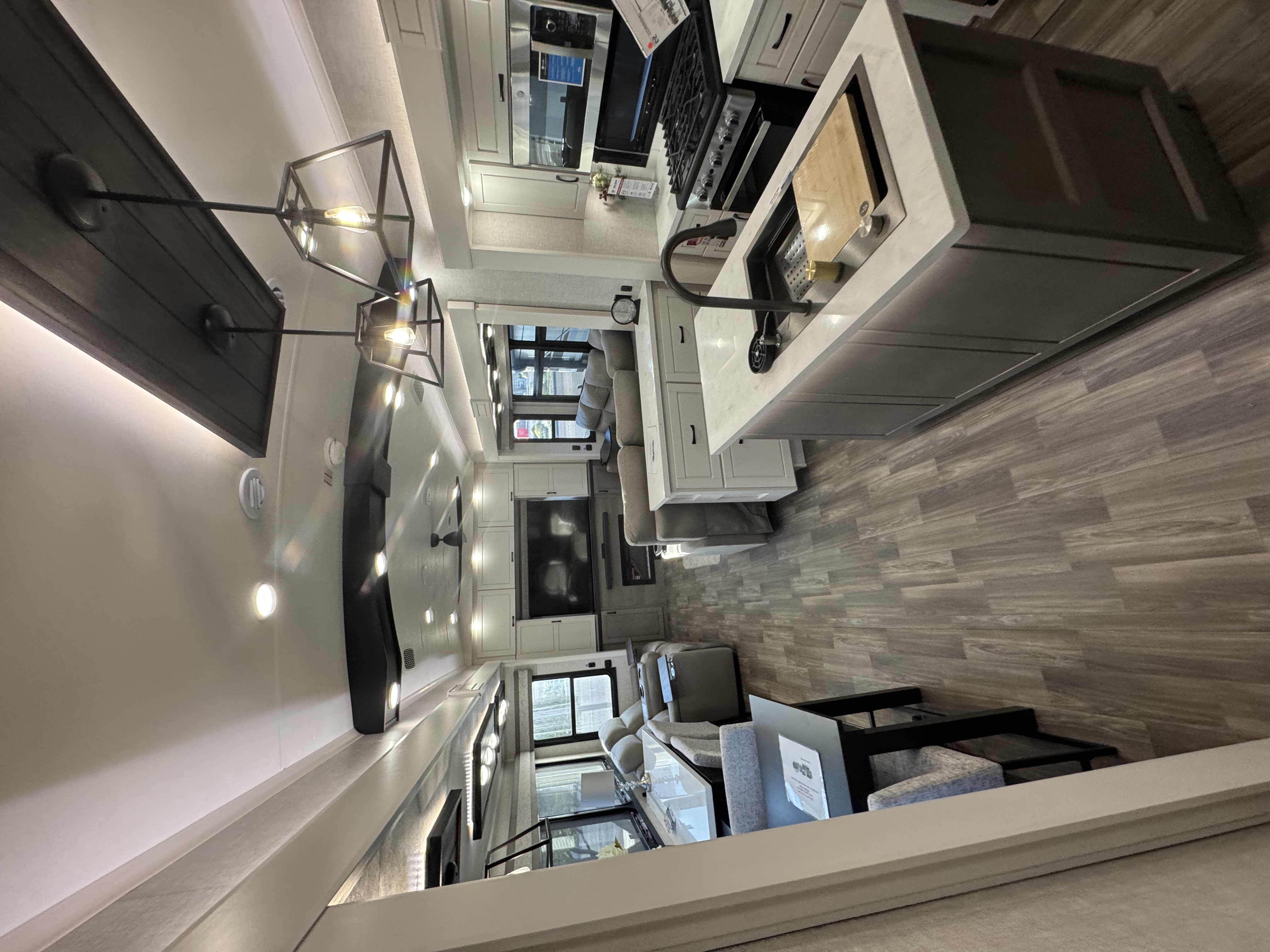 Inside the North Point, residential features abound, including GE Profile appliances – a GE 21 cu. ft. residential refrigerator with an 1800W inverter, GE Profile Series 30 in. residential convection microwave with built-in air fryer and a residential 24 in. range. These residential appliances provide convenience that mirrors the ease of cooking at home. An added bonus is the built-in microwave air fryer, reducing the need for one more small appliance to clutter the counter space. The kitchen also features a new flip-up island countertop extension and pull-out utility storage under the sink (most models) for extended workspace for cooking, entertaining or serving food.