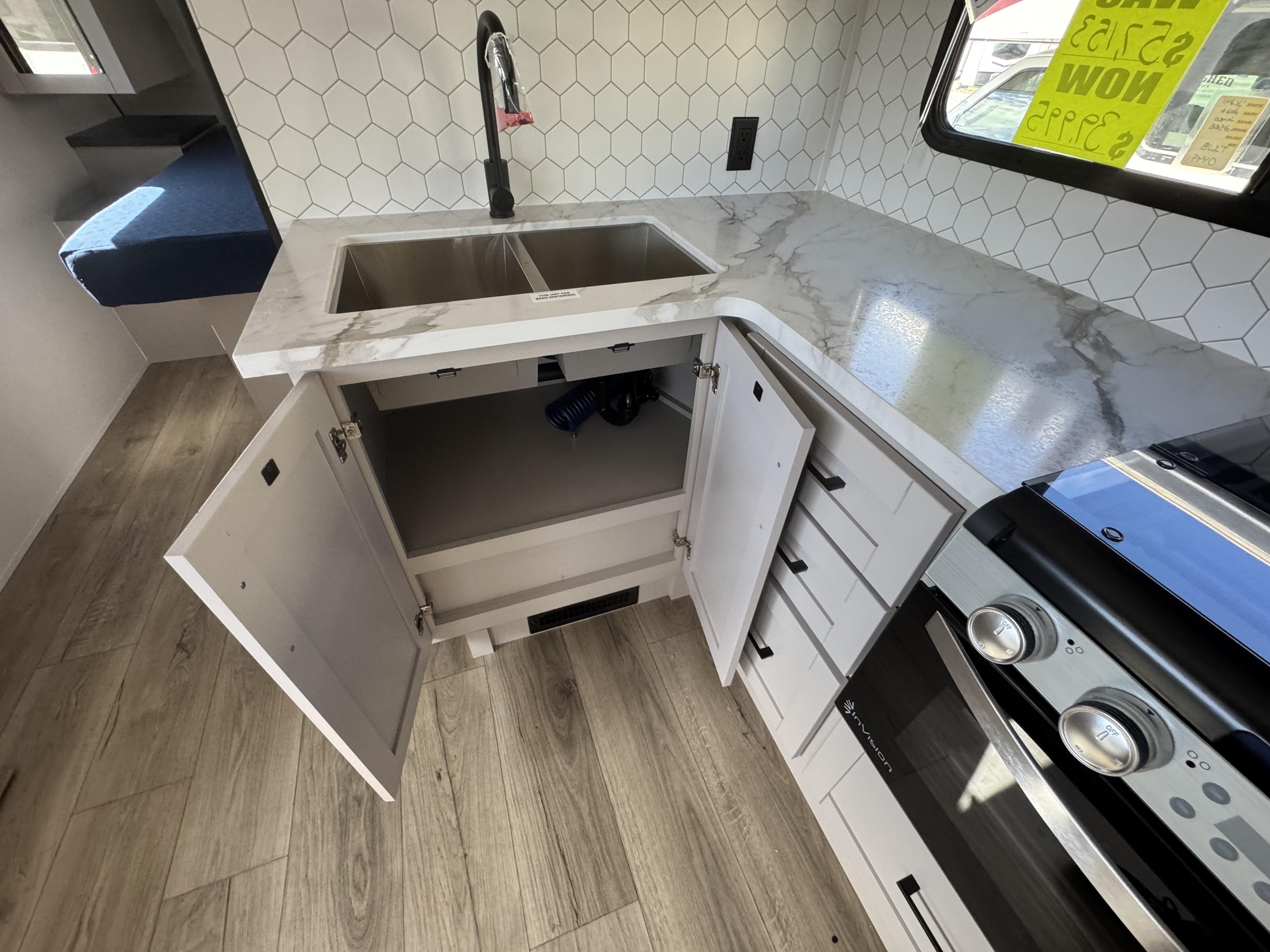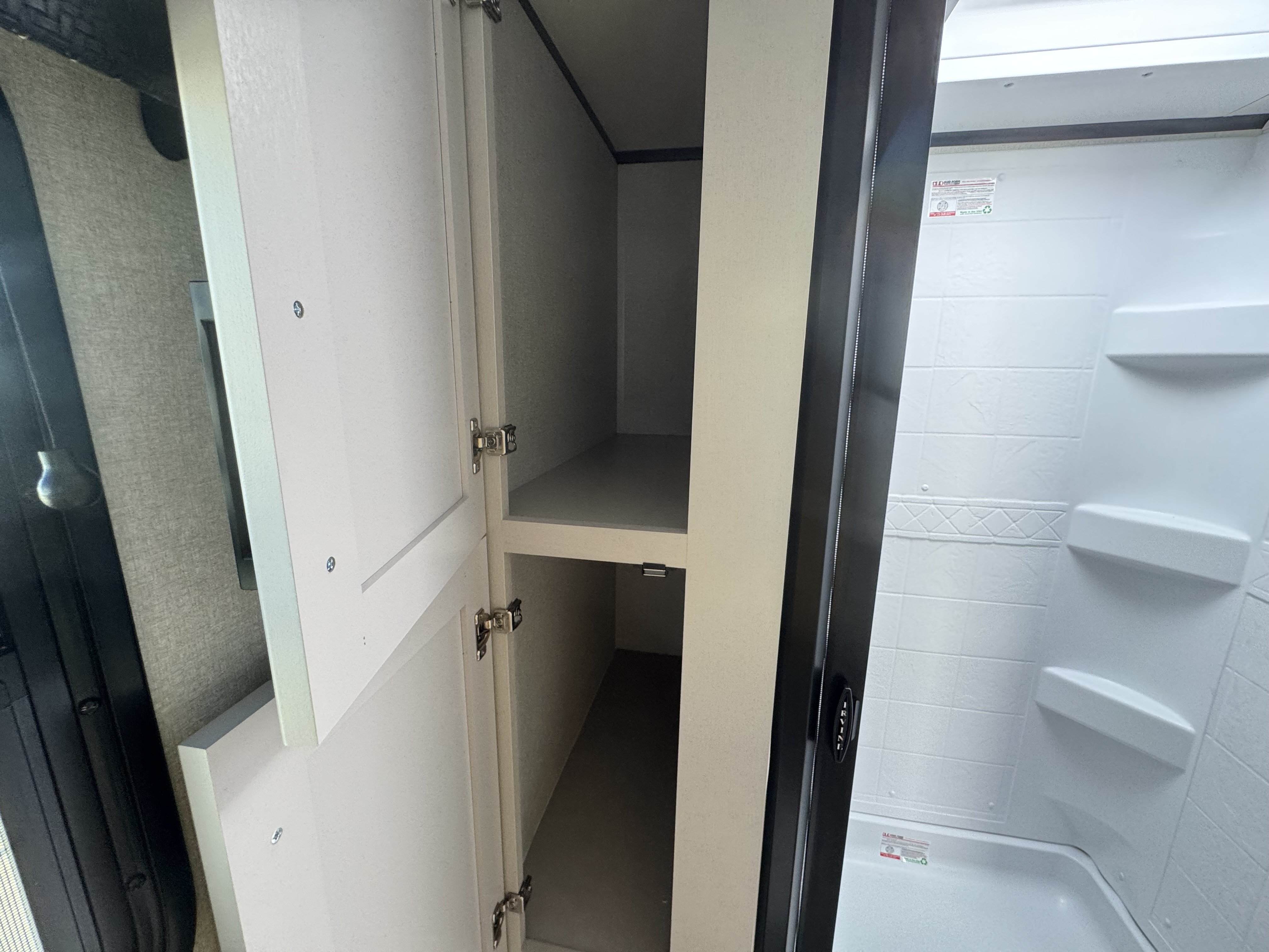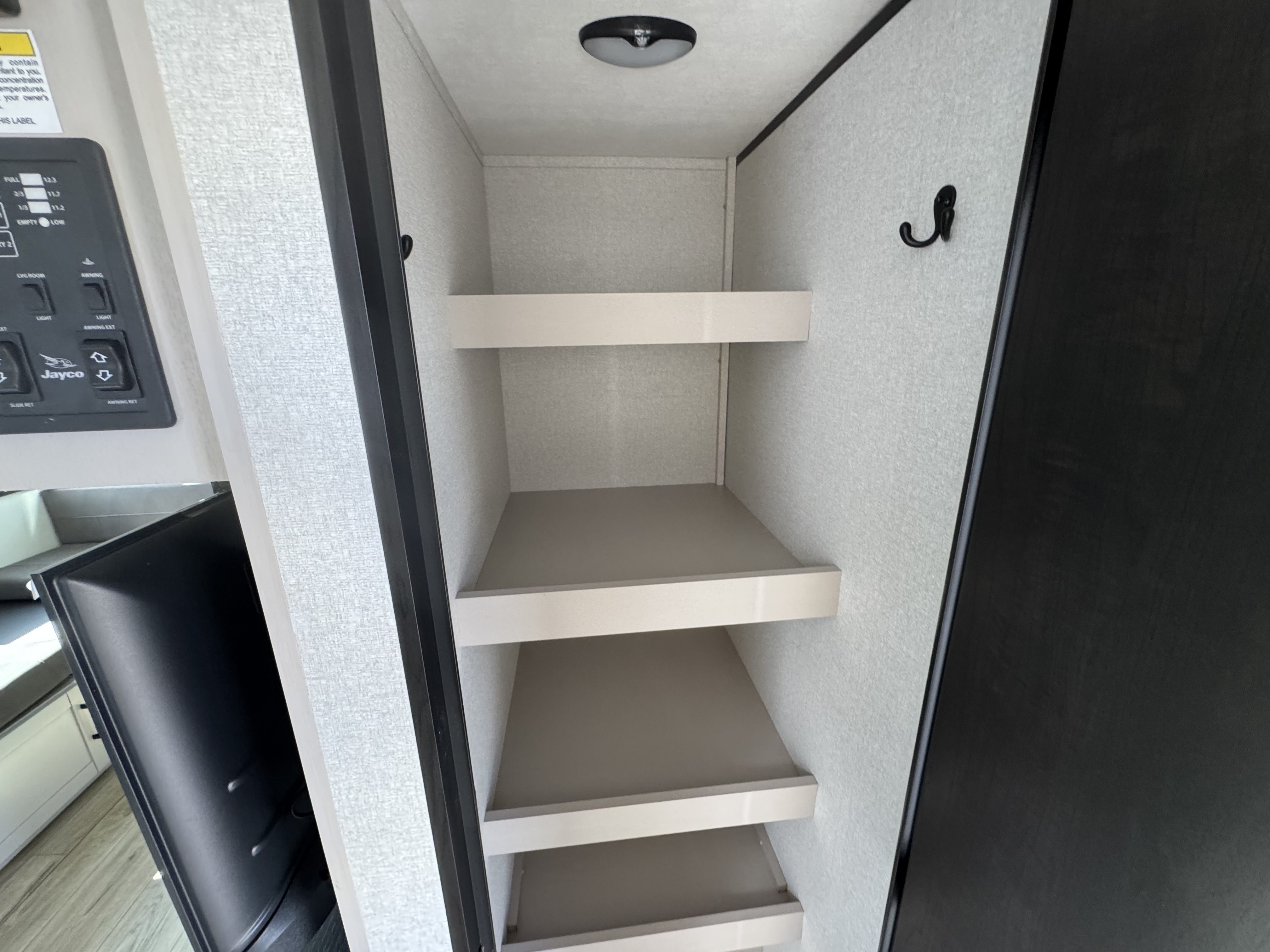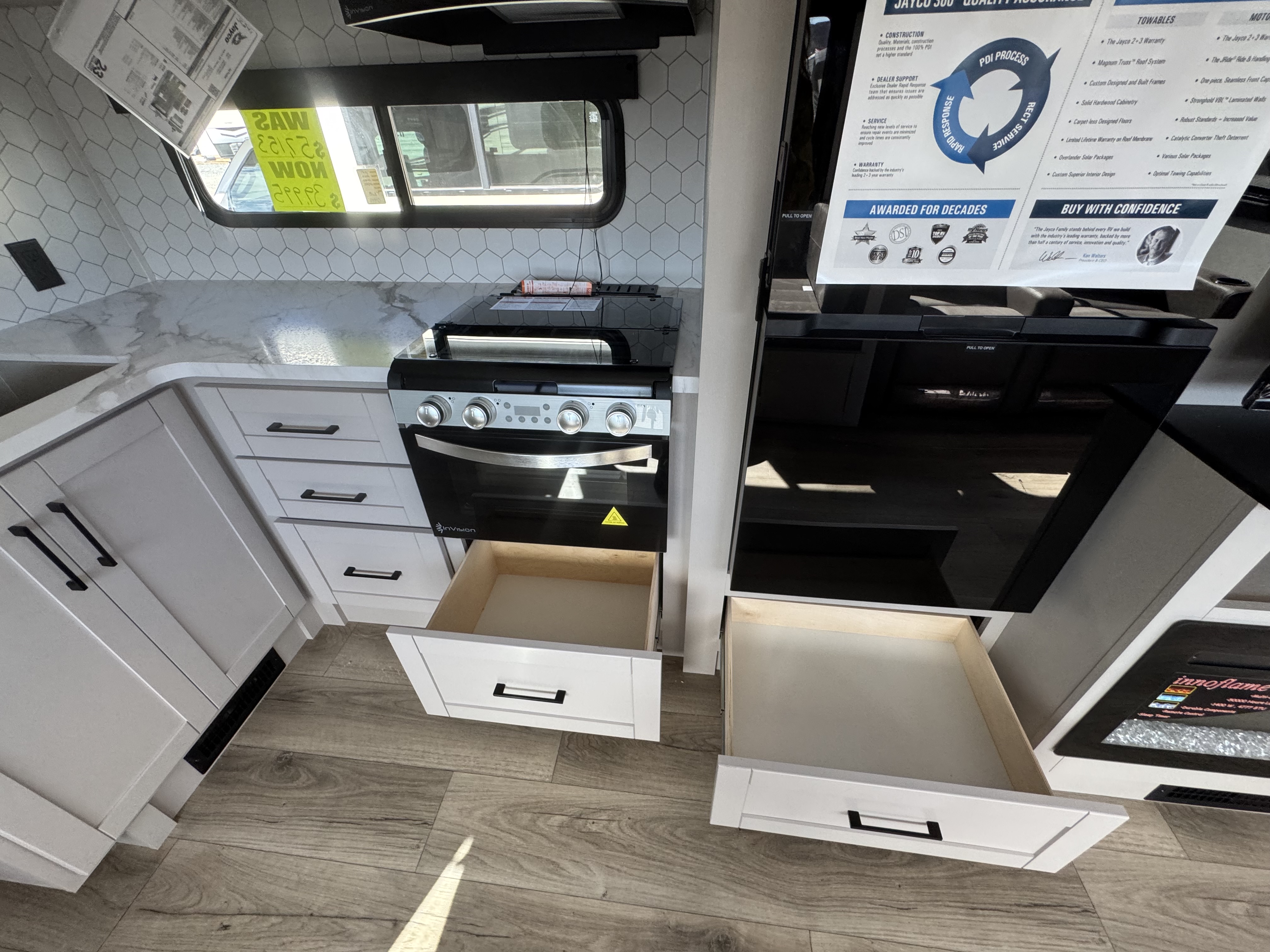 The amenities for 2026 don’t stop there! In the kitchen area, you'll find seamless countertops throughout, a stainless-steel sink with a large window. You'll also be blown away by the all-new InVision Suite appliance package with an 11 cu. ft. 12V fridge, standard in all Jay Feather models. This fridge has a shiny, black glass front with a two-door fridge over the freezer. Store more on the go with oversized cabinet doors and drawers. The cabinet doors are attached with hidden hinges to give each Jay Feather that sought-after residential look and feel.