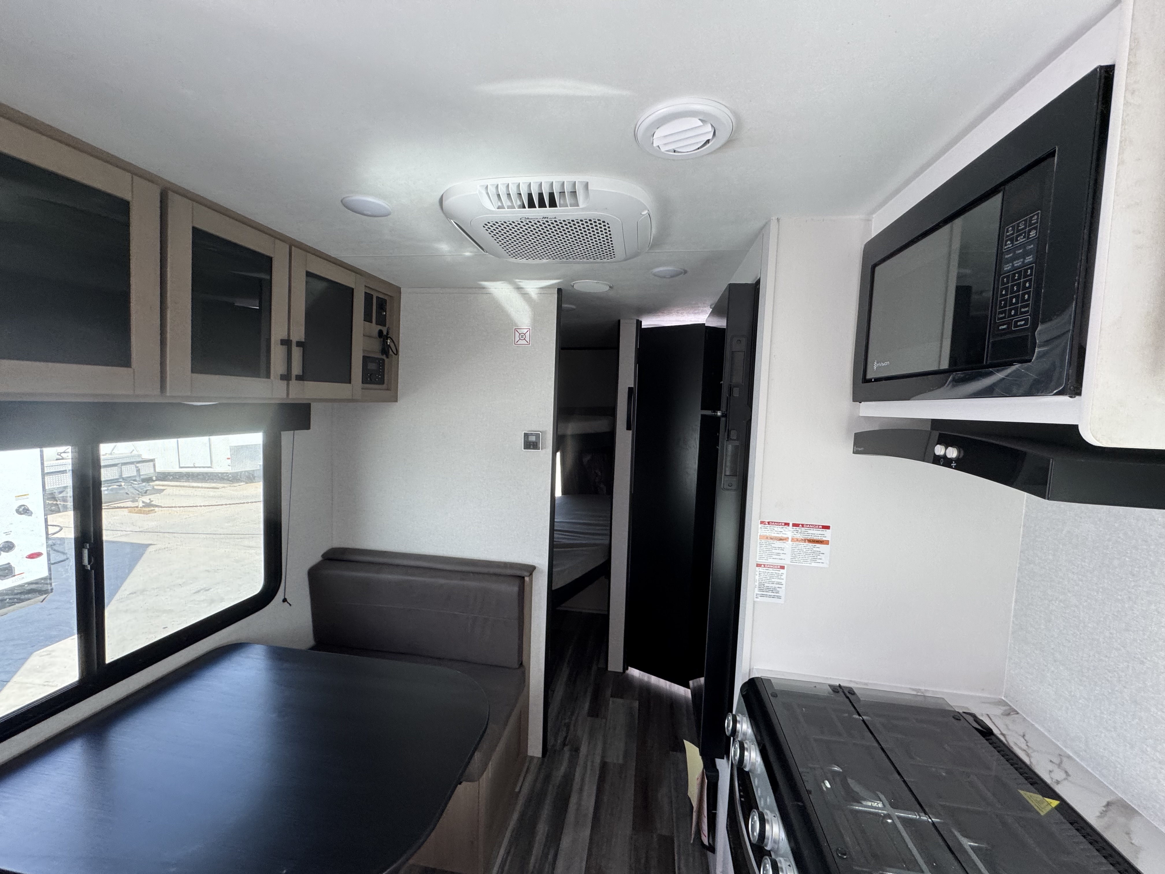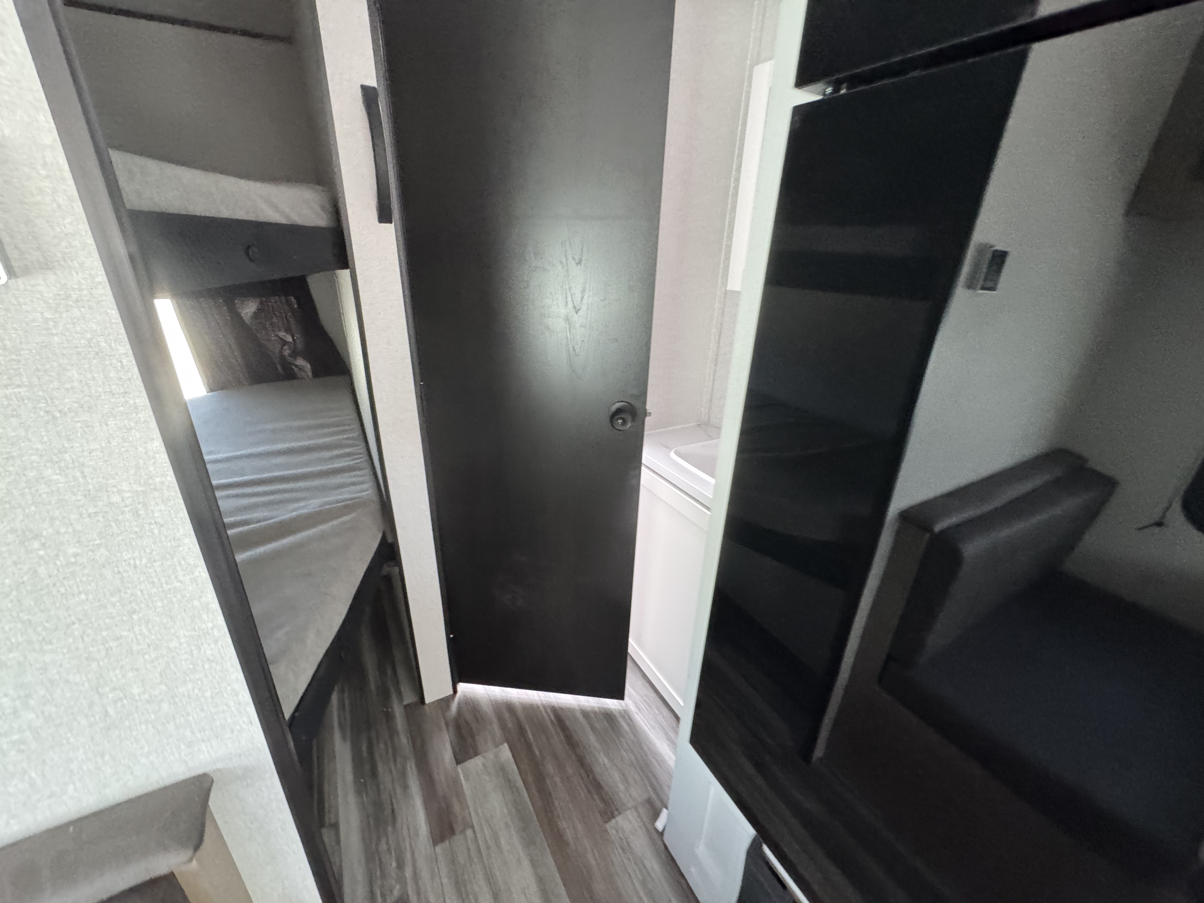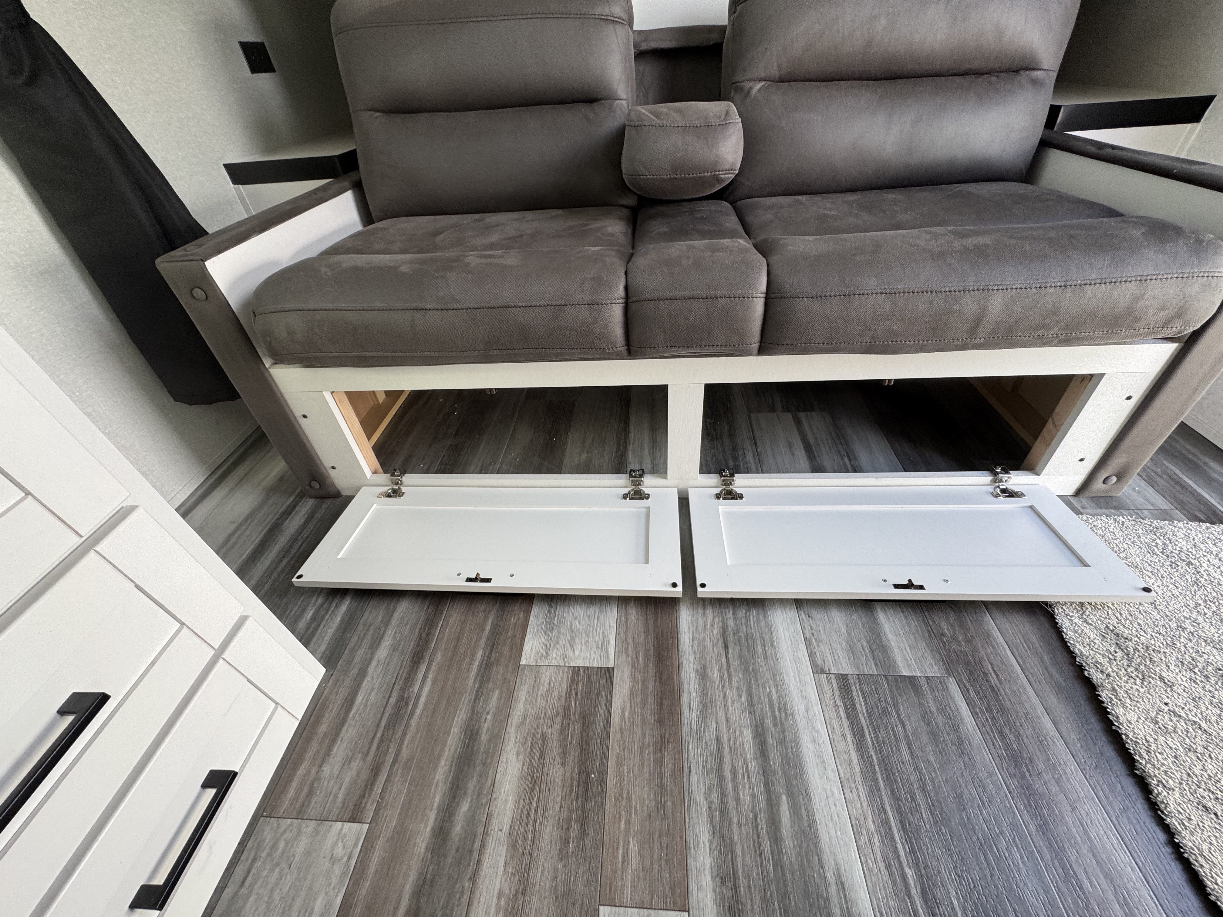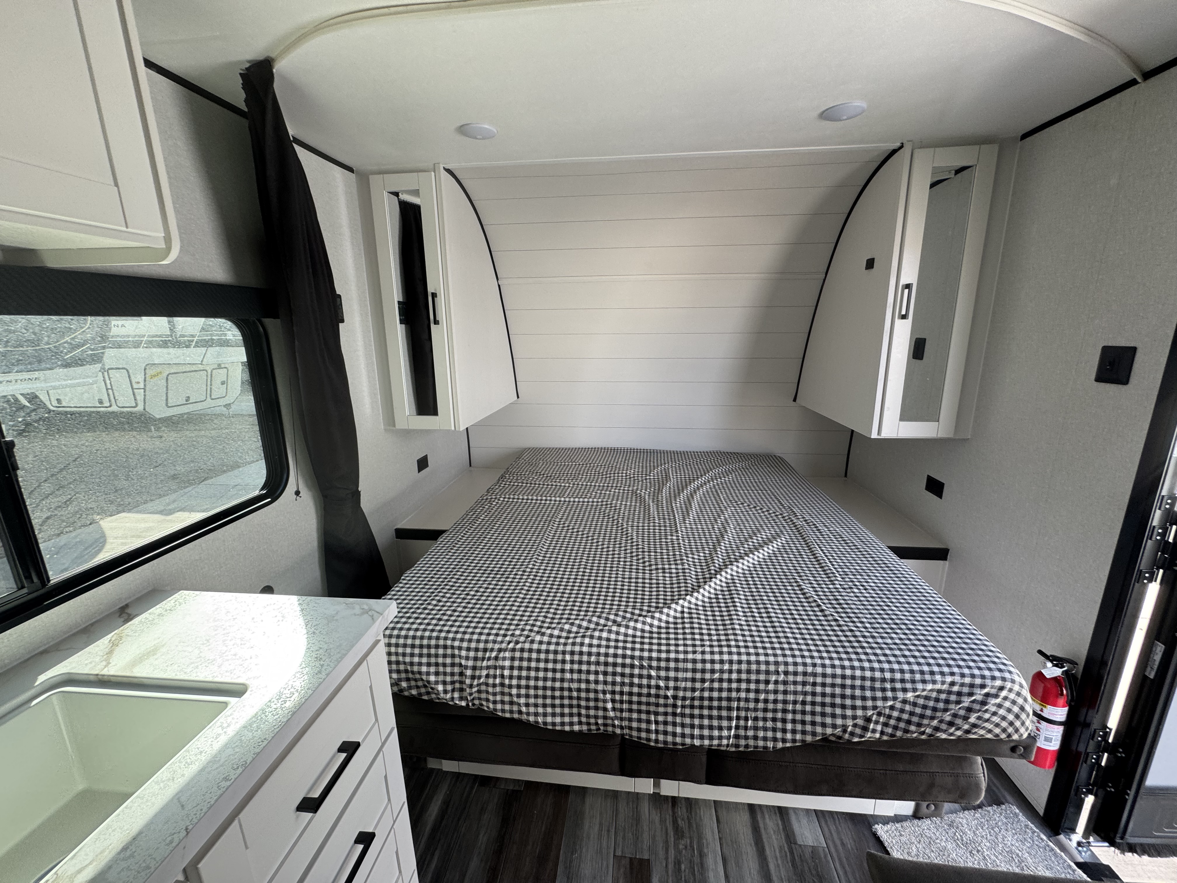 Inside, you’ll find solid hardwood cabinet doors with hidden hinges, giving the space a modern, residential feel. Oversized cabinets and under-bed storage ensure there’s room for everything you need, while the lit exterior passthrough storage makes packing and unpacking a breeze.