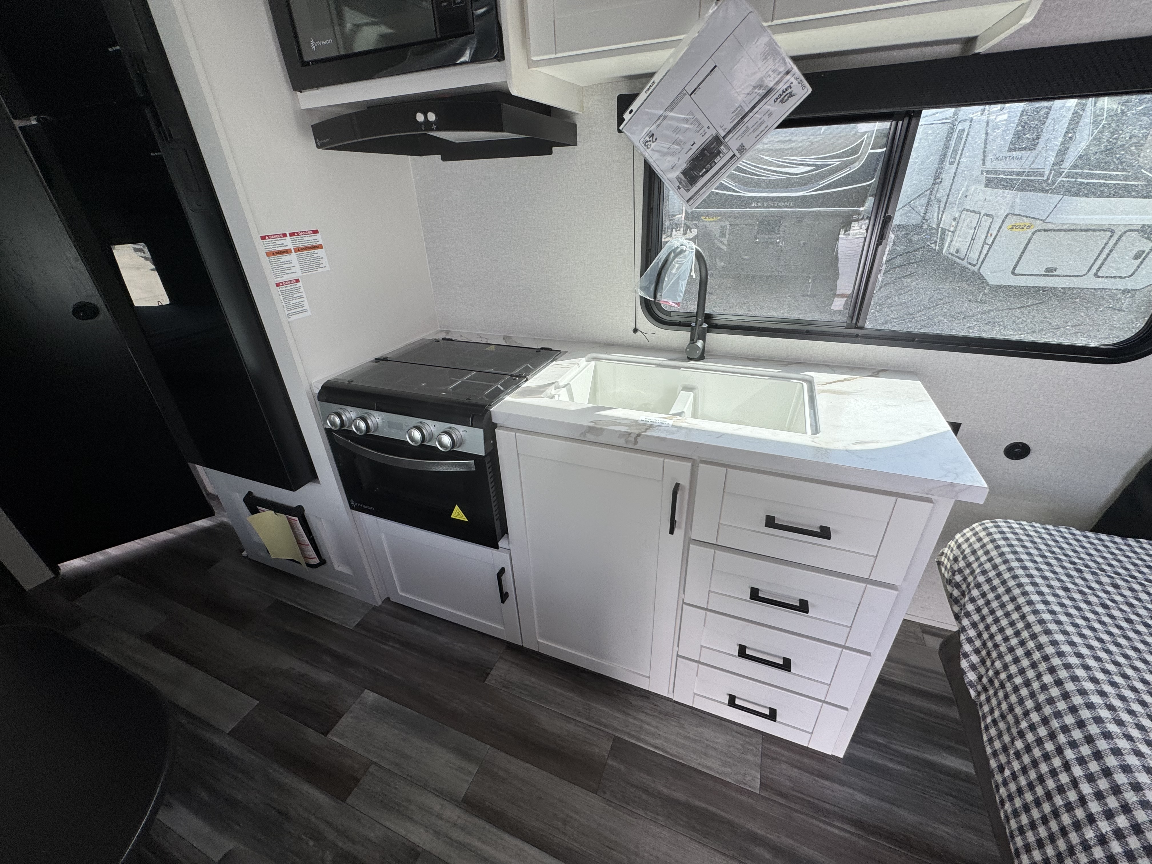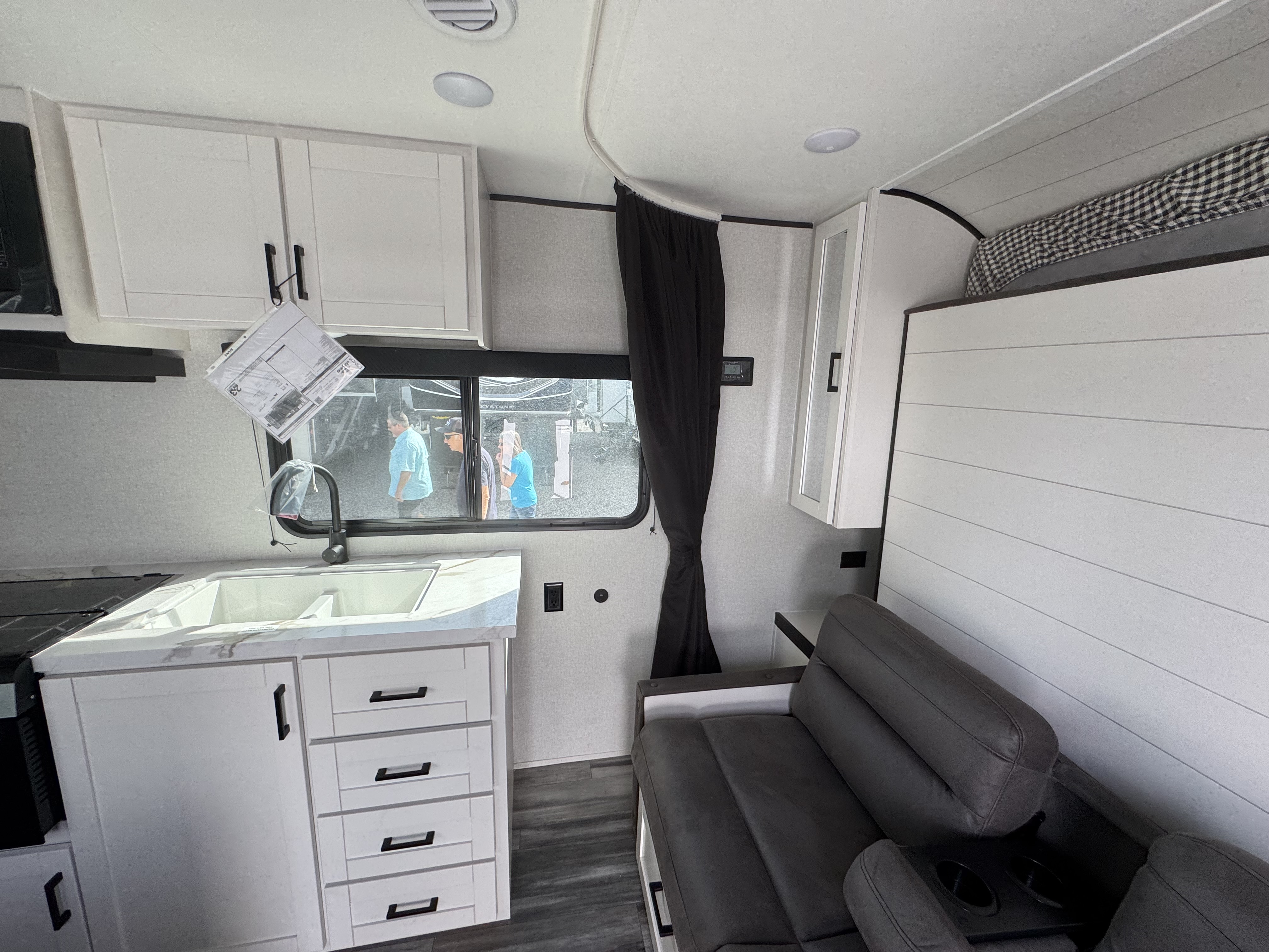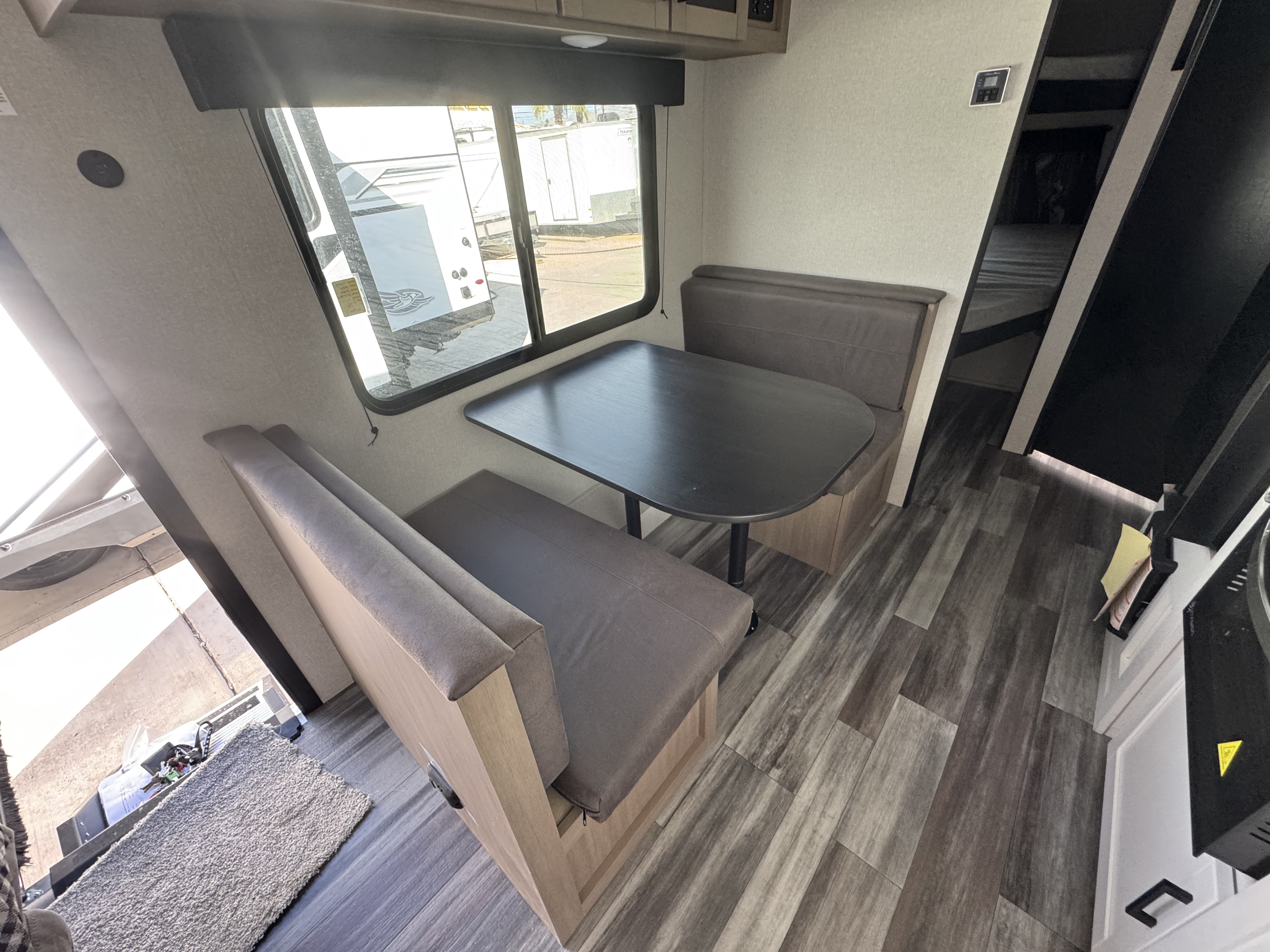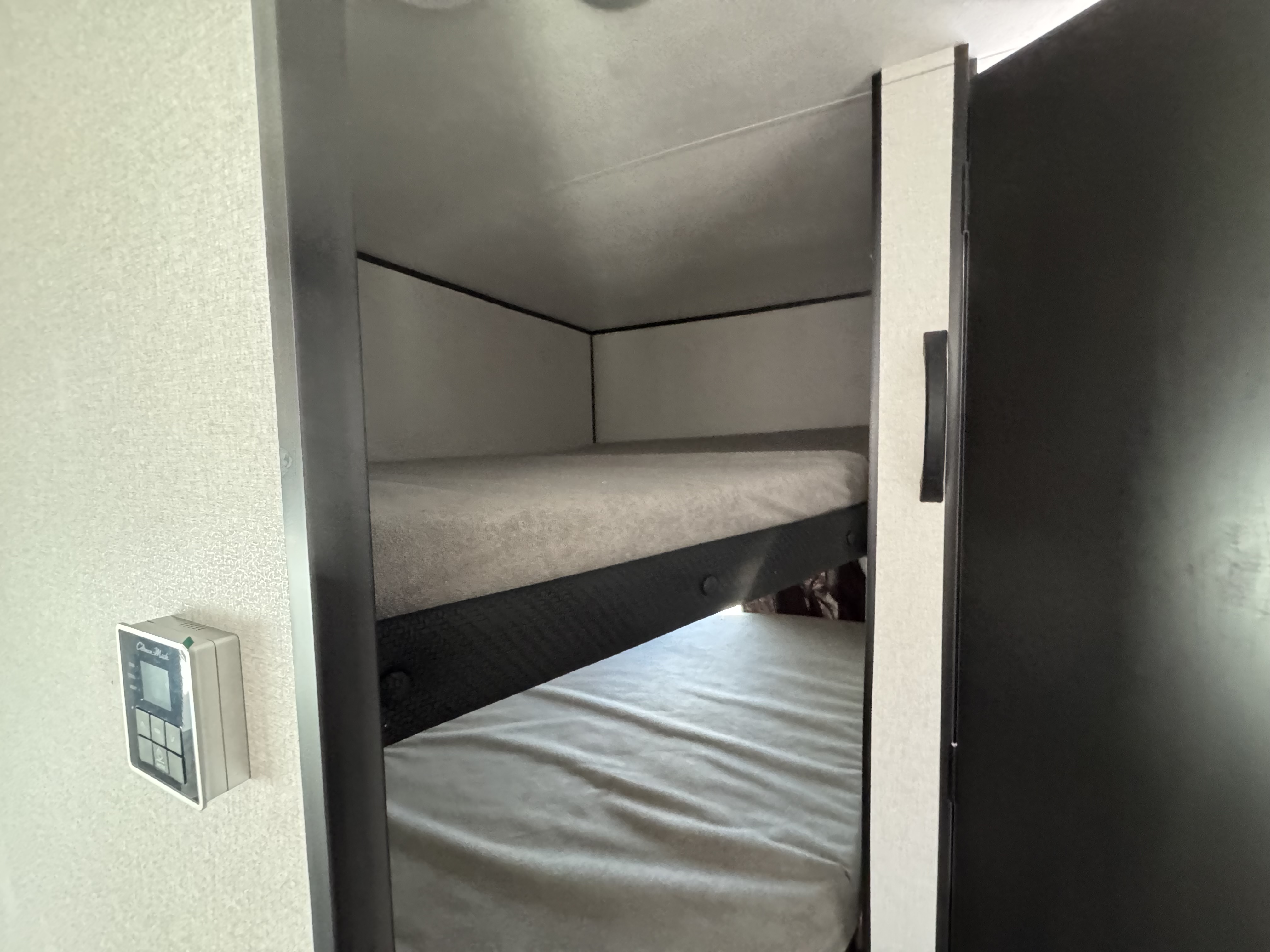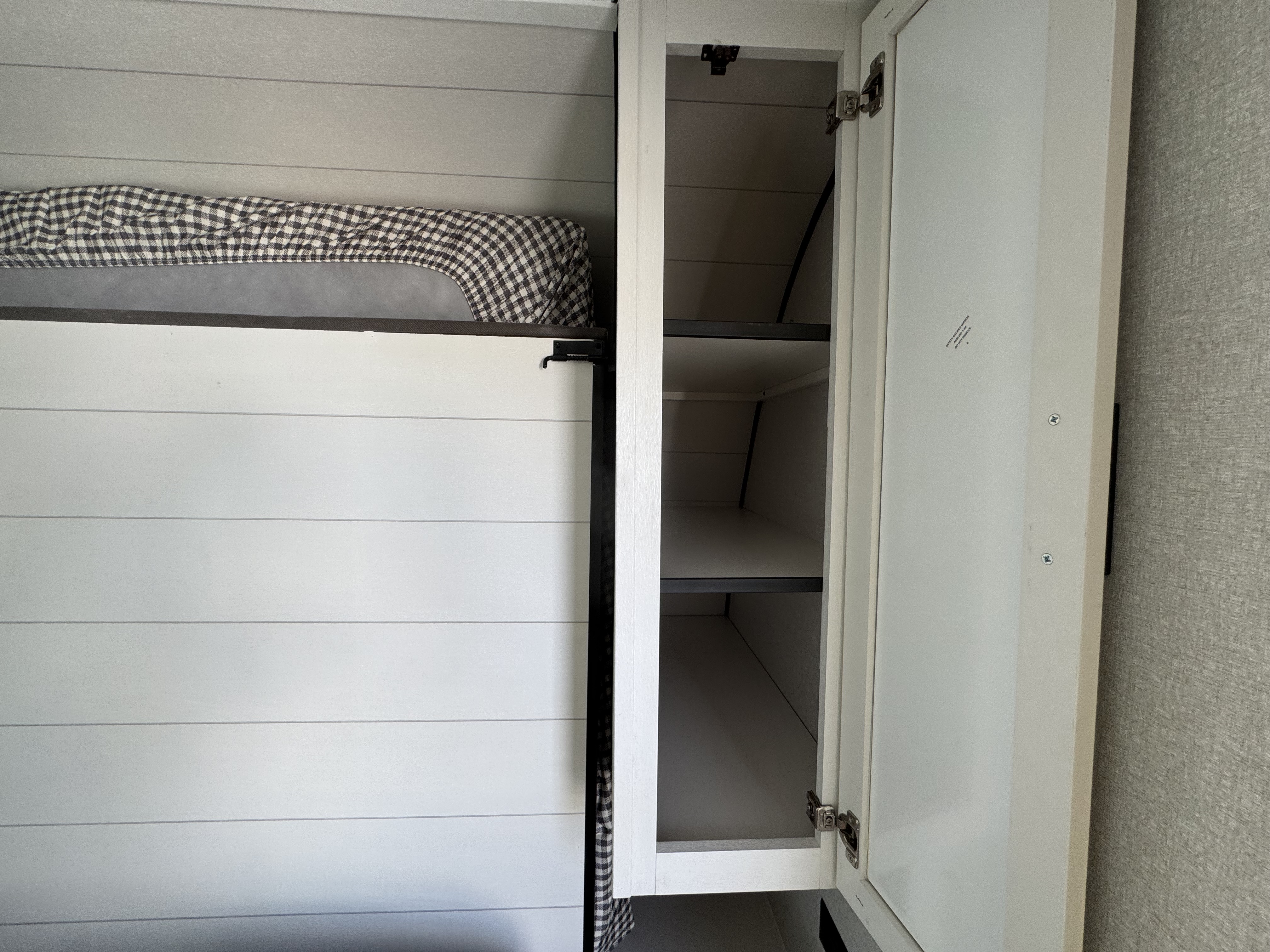 Inside, you’ll find solid hardwood cabinet doors with hidden hinges, giving the space a modern, residential feel. Oversized cabinets and under-bed storage ensure there’s room for everything you need, while the lit exterior passthrough storage makes packing and unpacking a breeze.