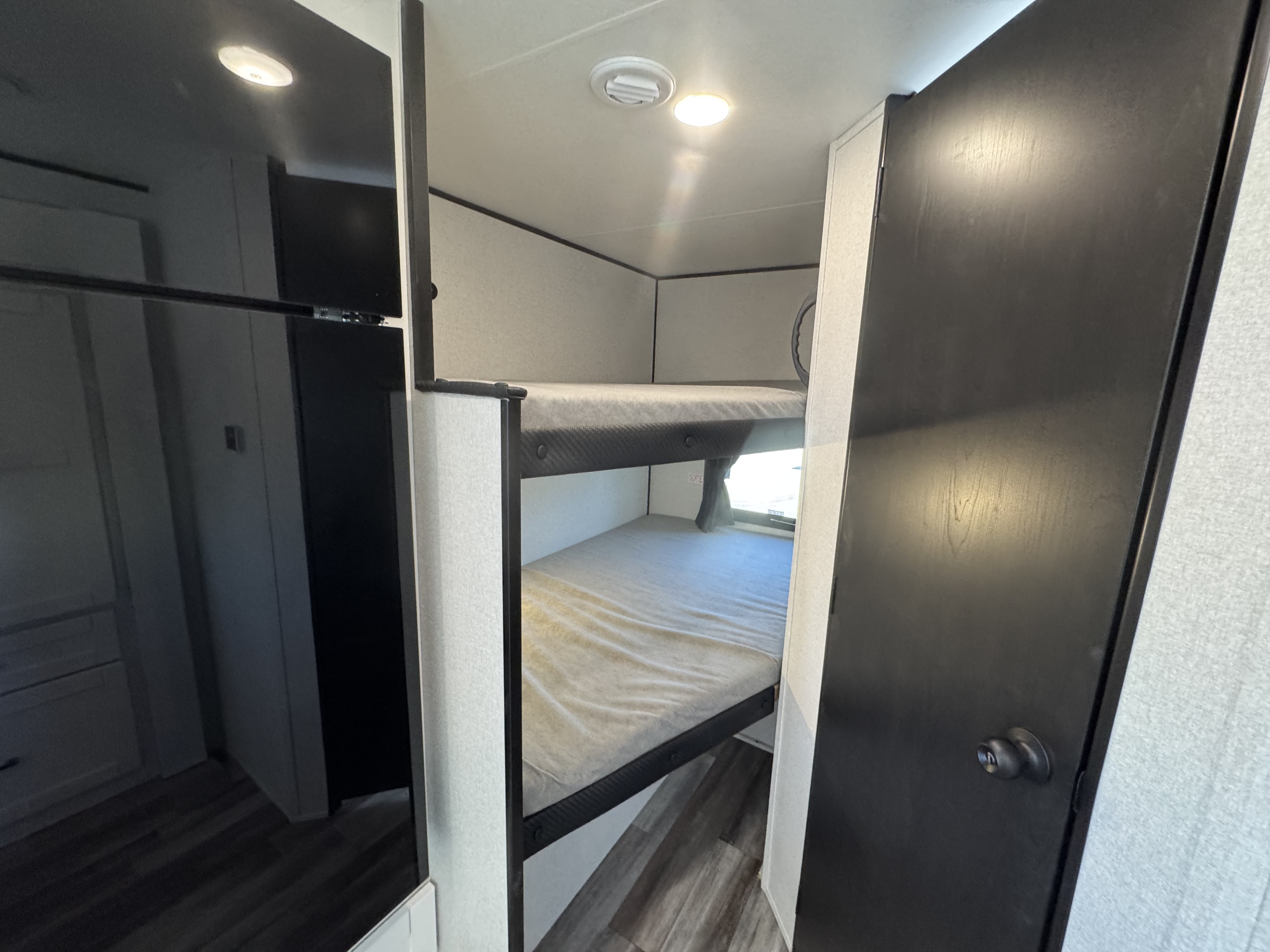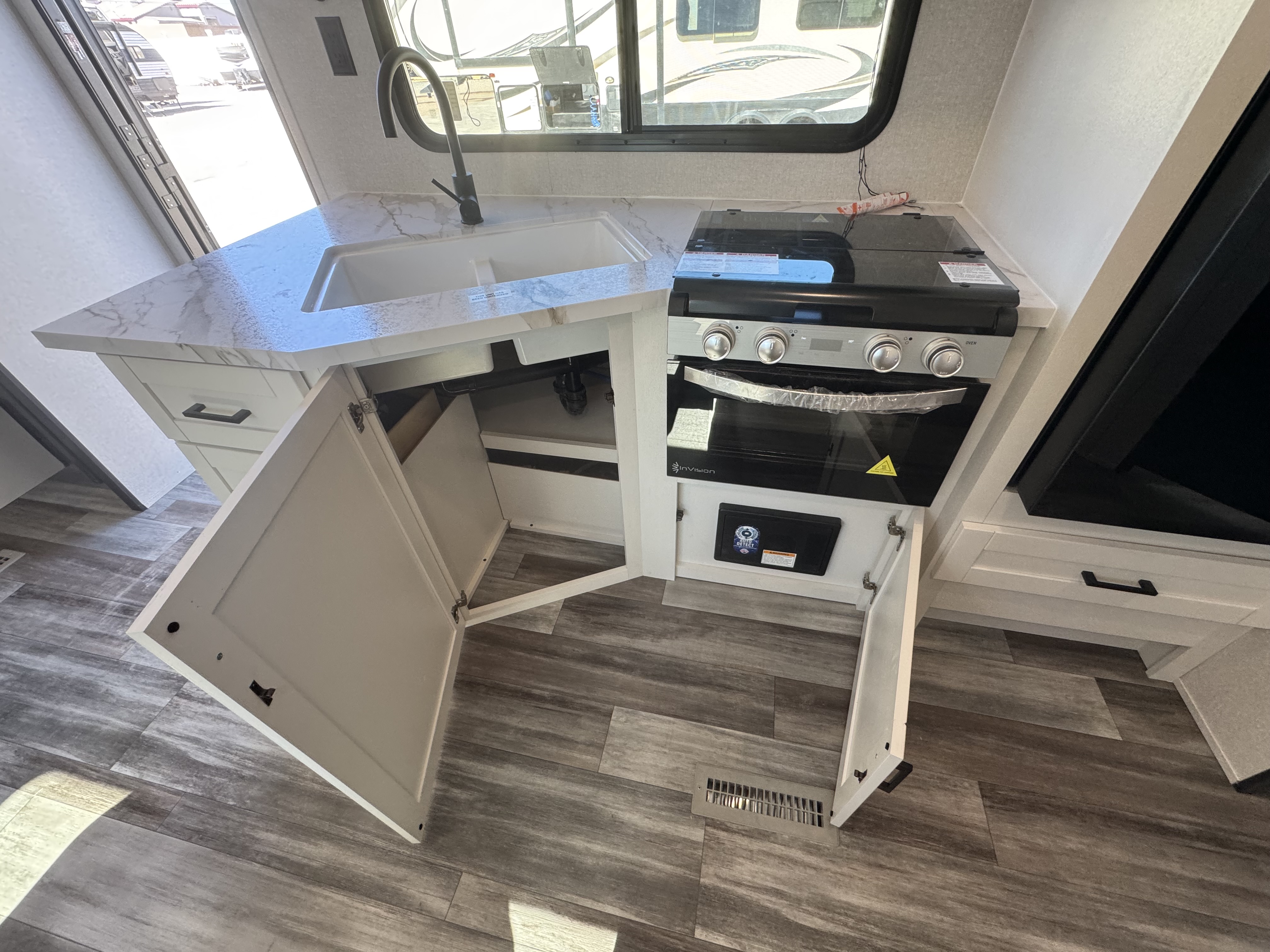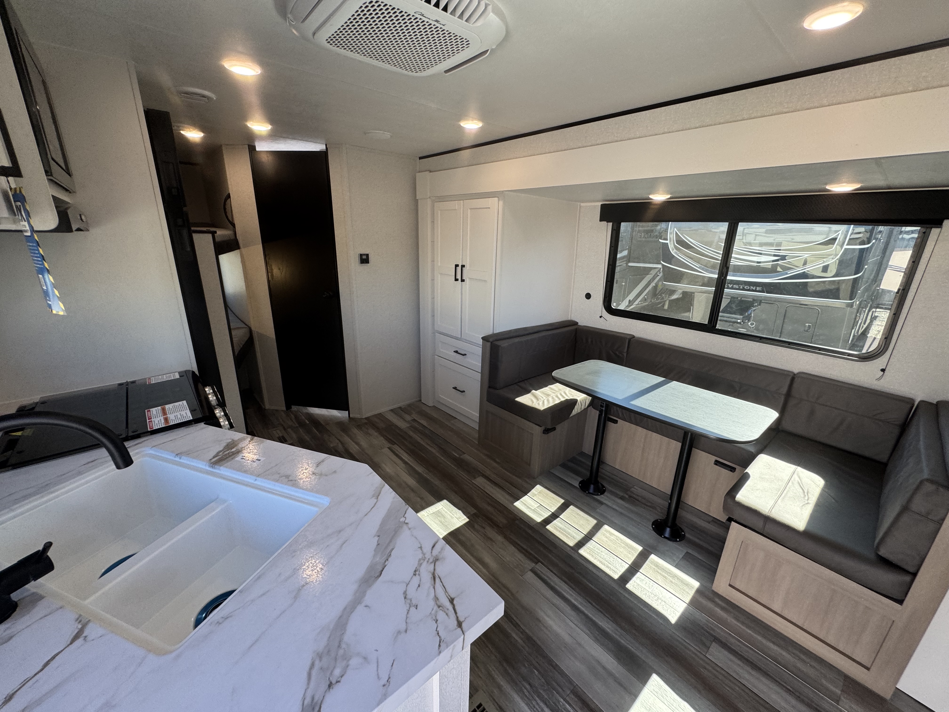 Inside, you’ll find solid hardwood cabinet doors with hidden hinges, giving the space a modern, residential feel. Oversized cabinets and under-bed storage ensure there’s room for everything you need, while the lit exterior passthrough storage makes packing and unpacking a breeze.