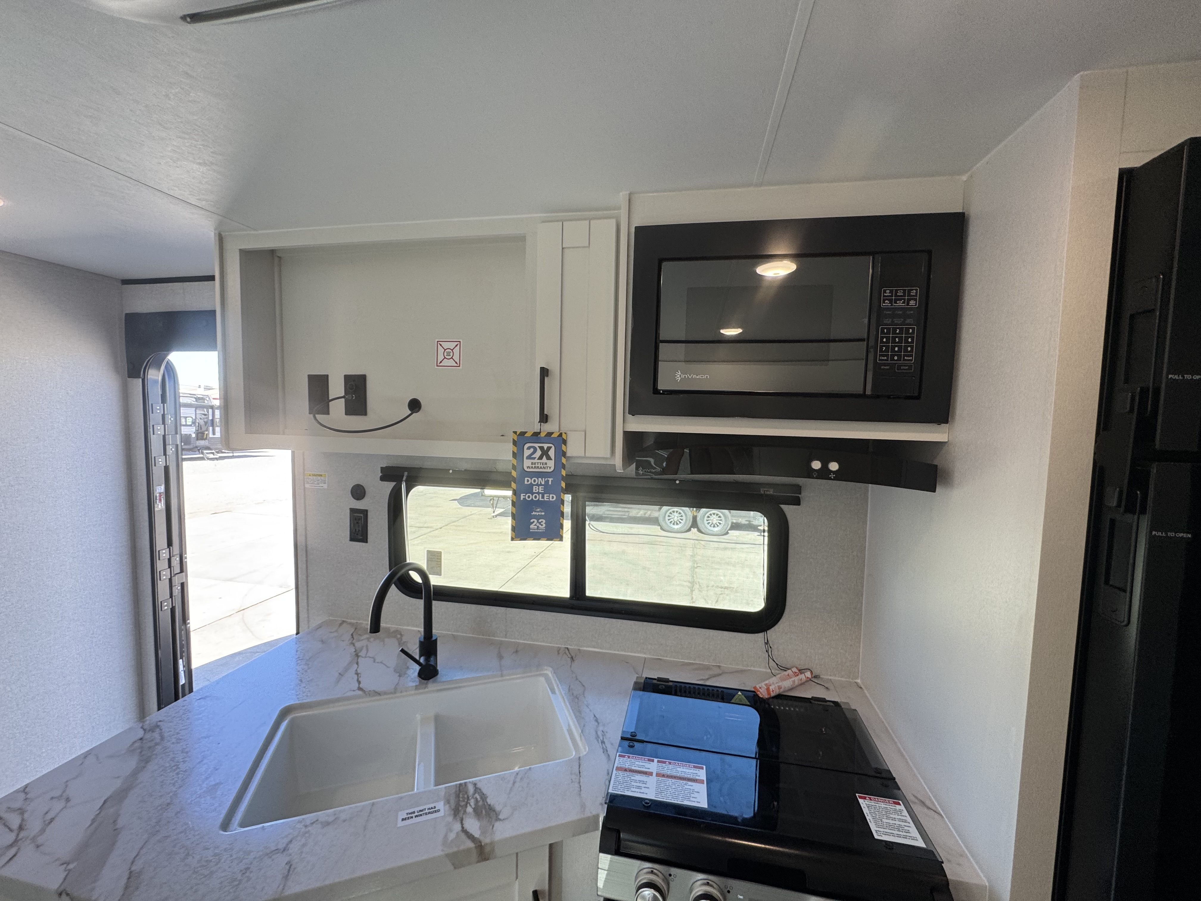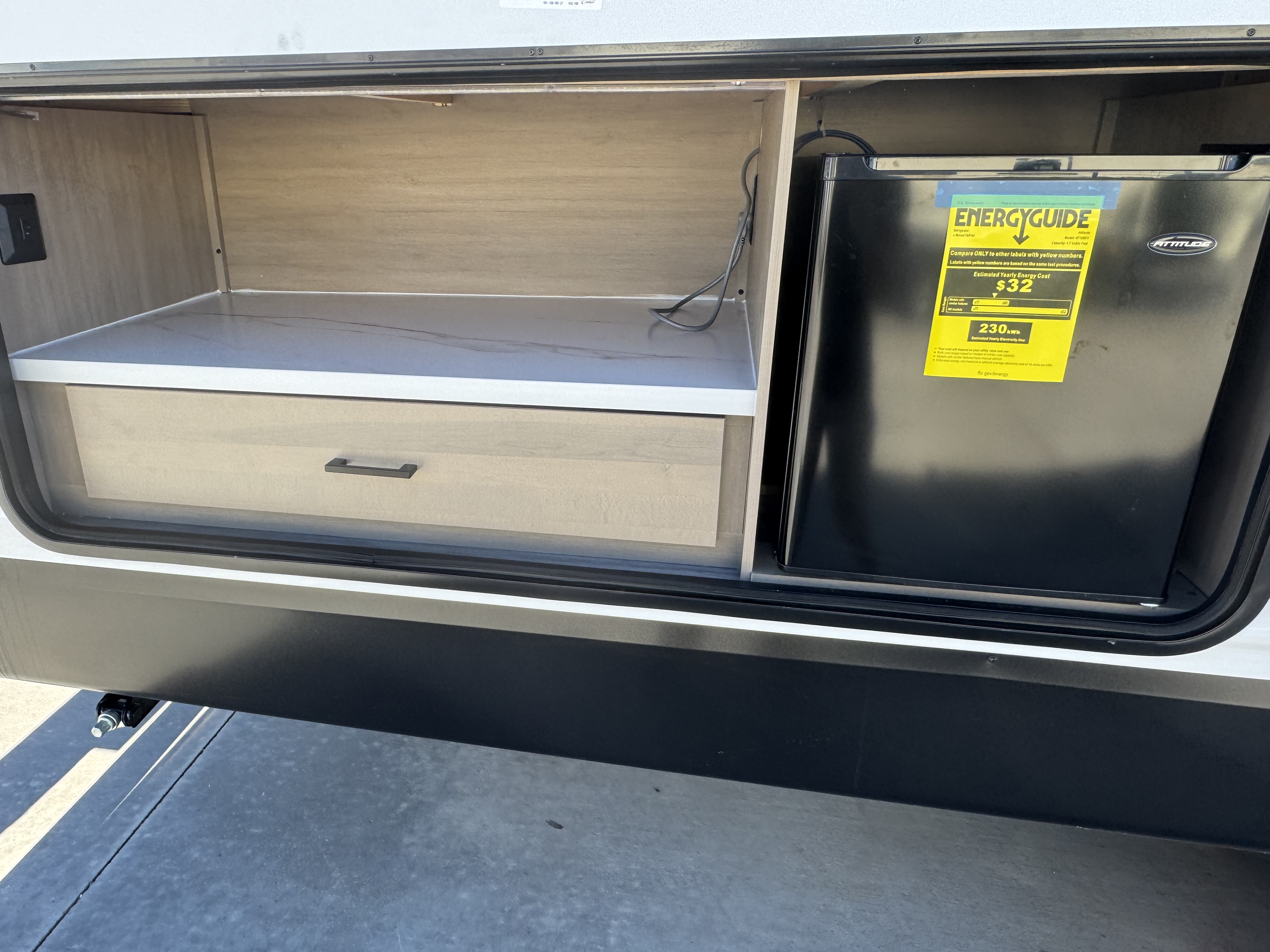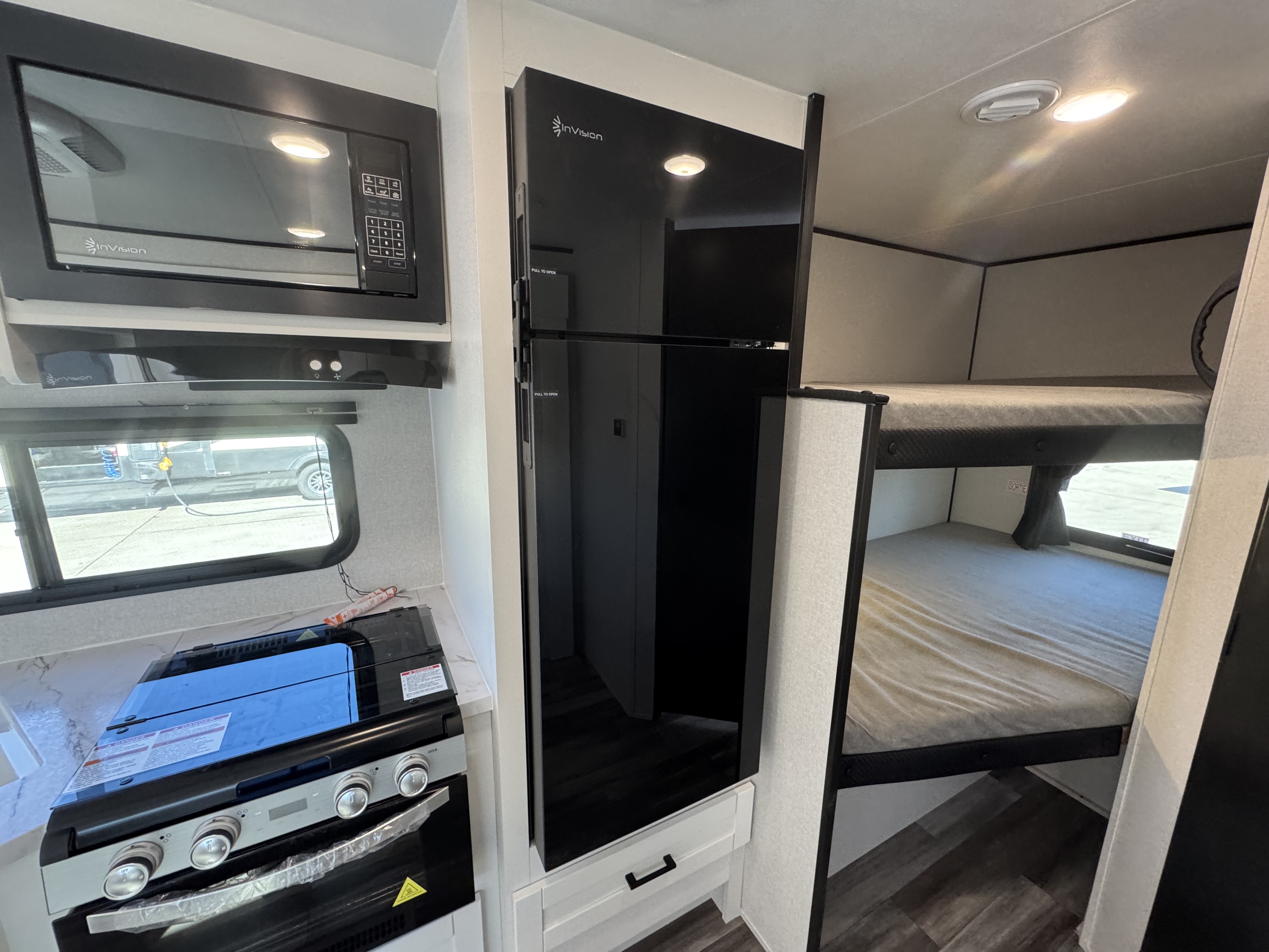 Inside, you’ll find solid hardwood cabinet doors with hidden hinges, giving the space a modern, residential feel. Oversized cabinets and under-bed storage ensure there’s room for everything you need, while the lit exterior passthrough storage makes packing and unpacking a breeze.