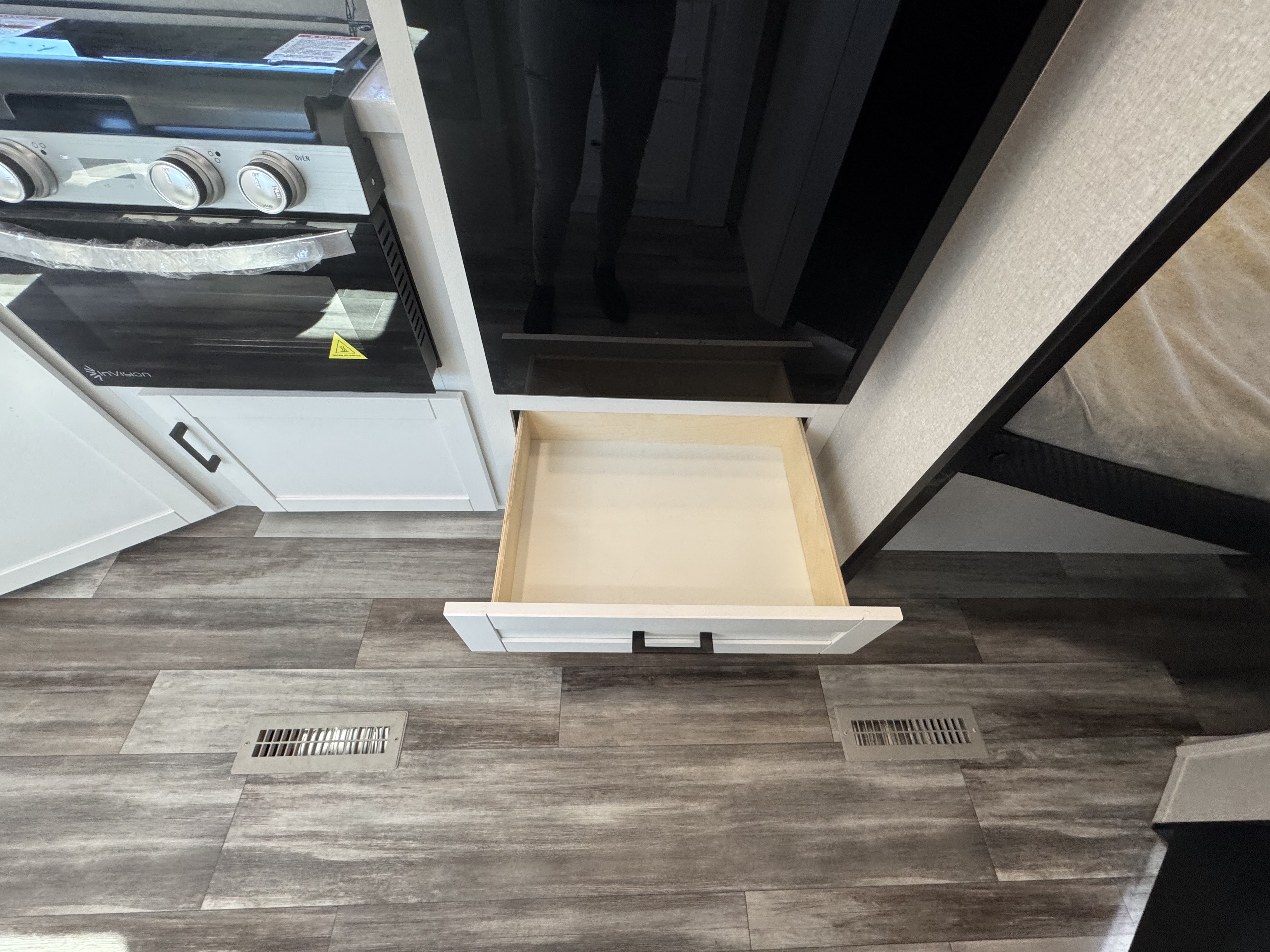 Inside, you’ll find solid hardwood cabinet doors with hidden hinges, giving the space a modern, residential feel. Oversized cabinets and under-bed storage ensure there’s room for everything you need, while the lit exterior passthrough storage makes packing and unpacking a breeze.