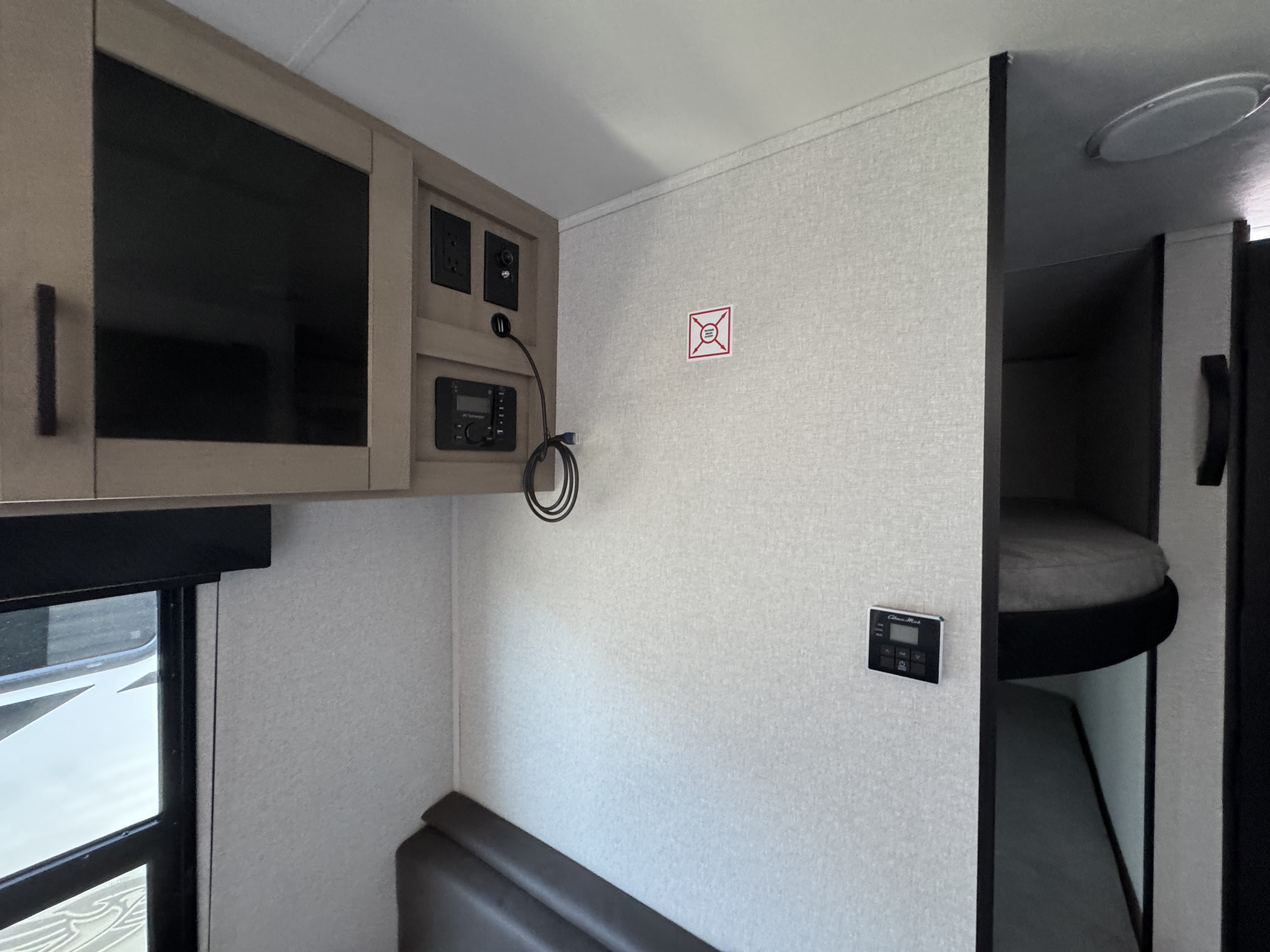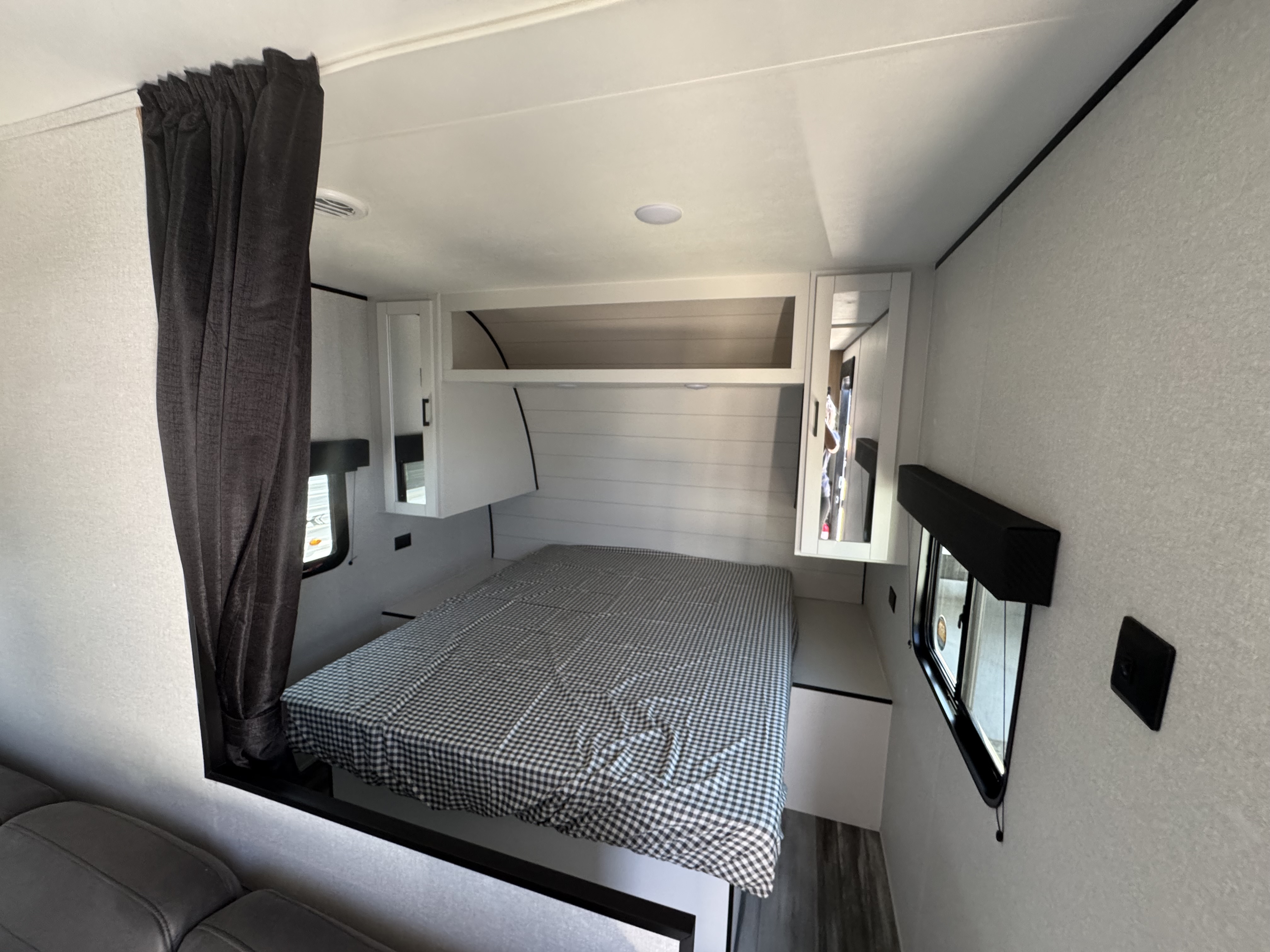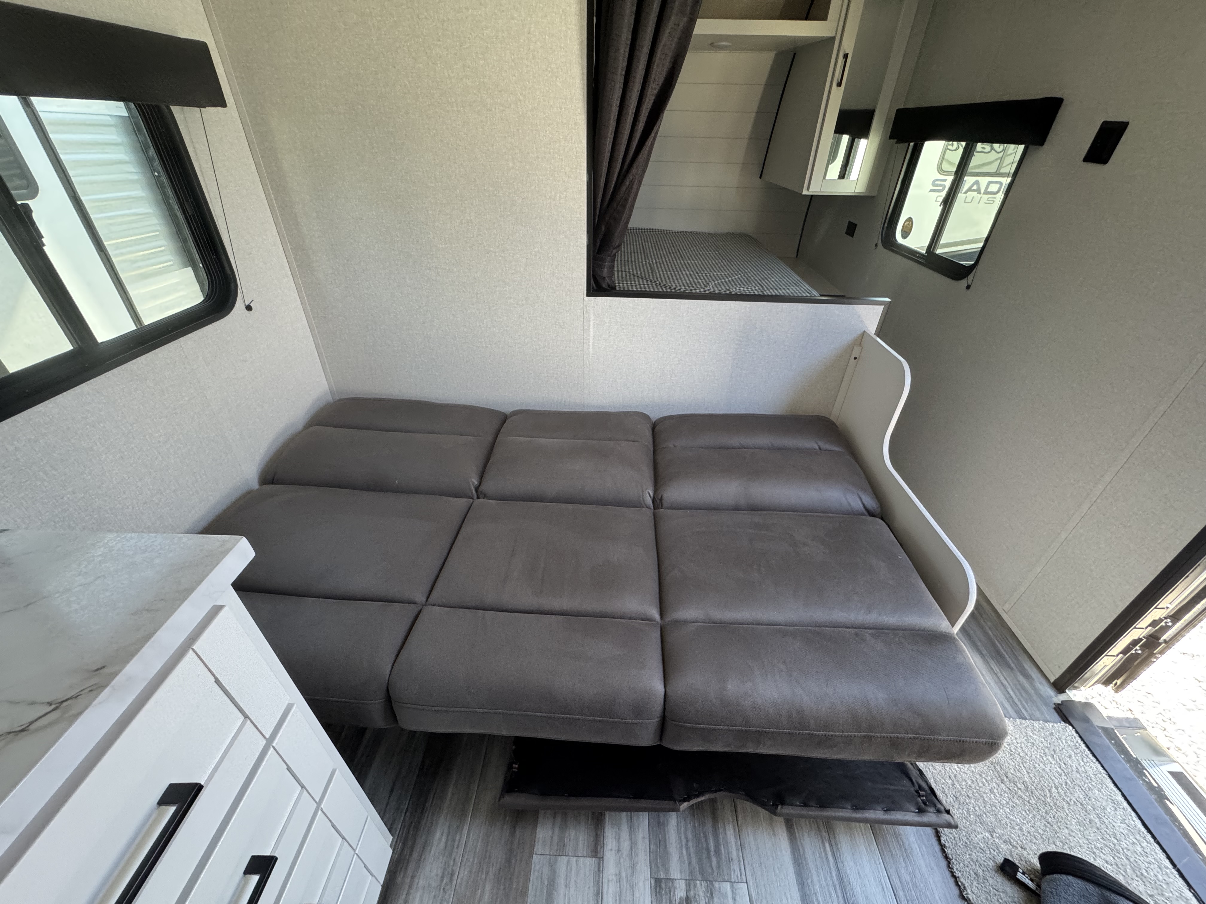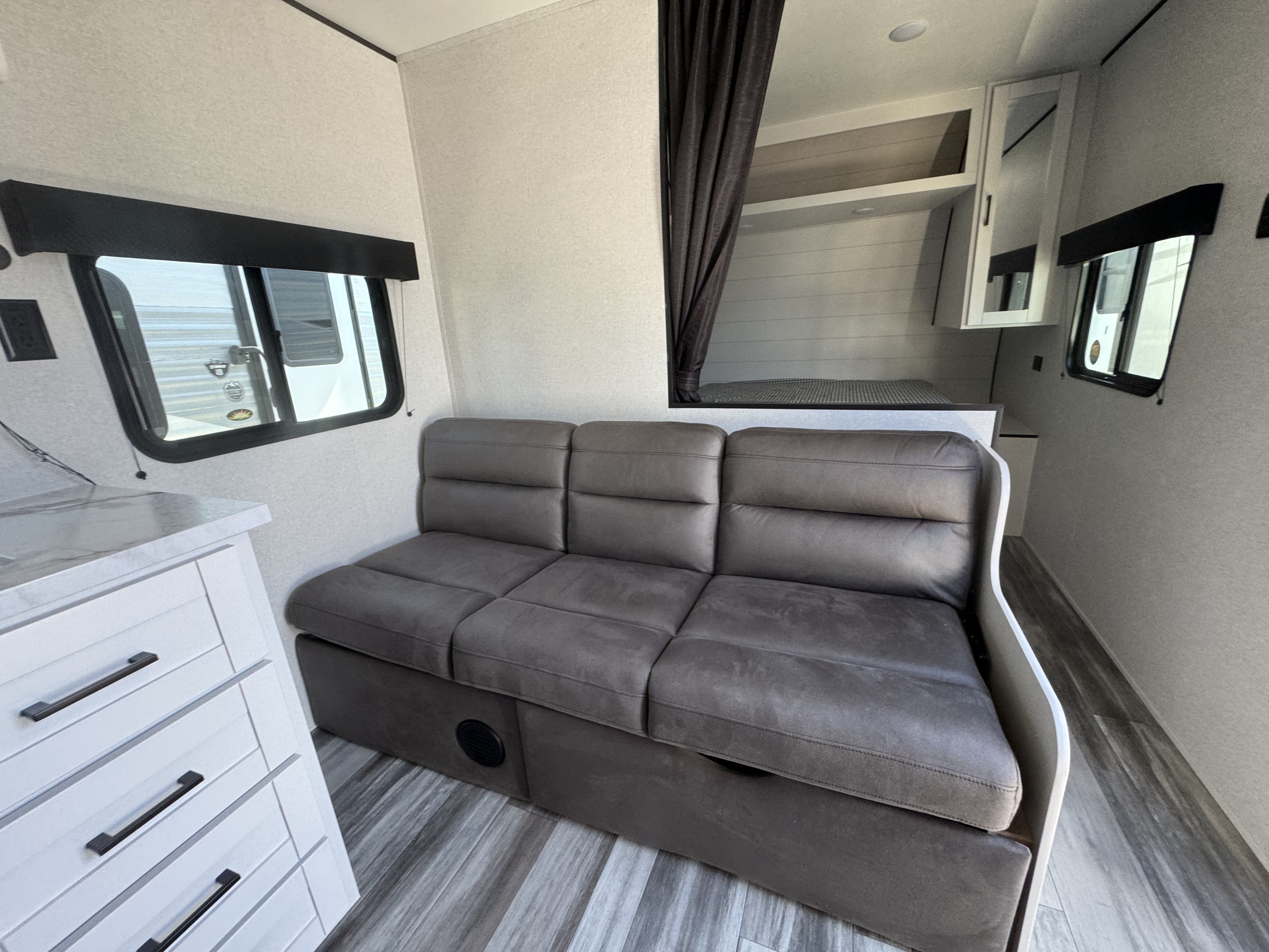 Inside, you’ll find solid hardwood cabinet doors with hidden hinges, giving the space a modern, residential feel. Oversized cabinets and under-bed storage ensure there’s room for everything you need, while the lit exterior passthrough storage makes packing and unpacking a breeze.