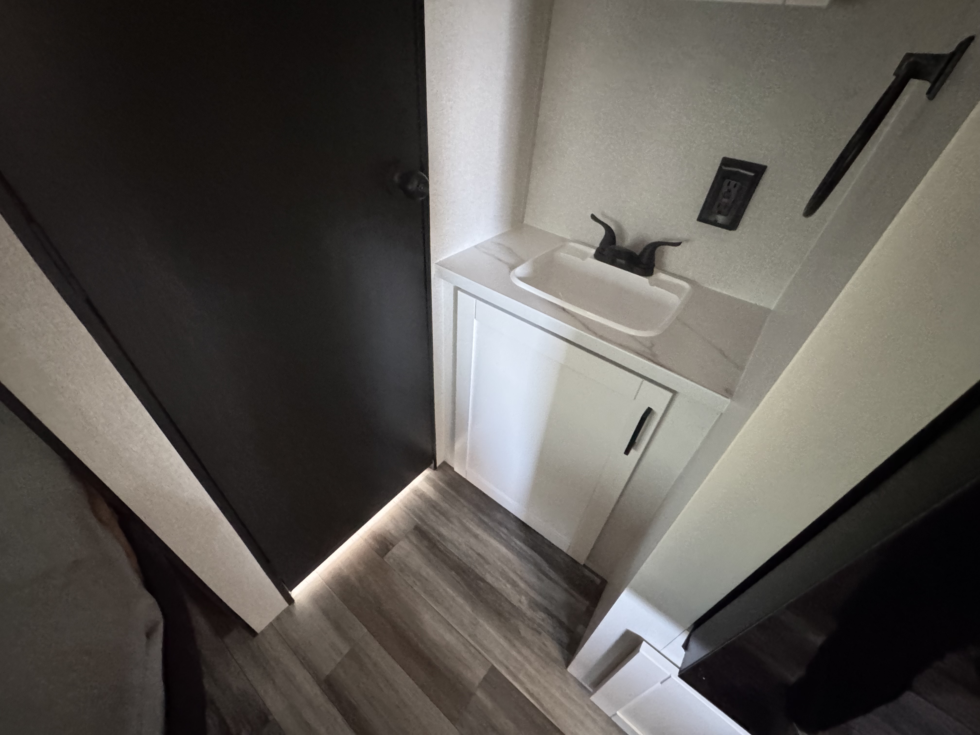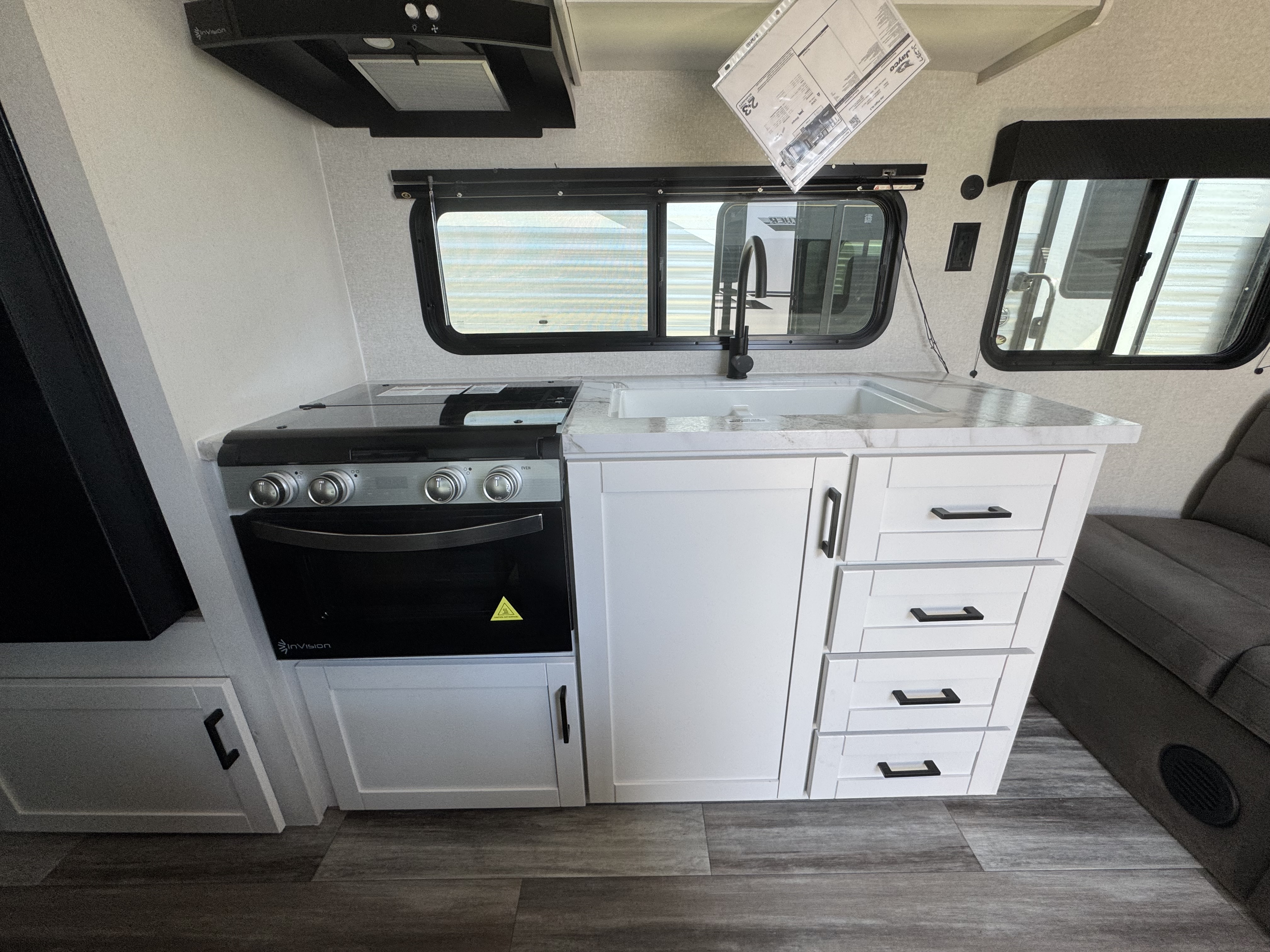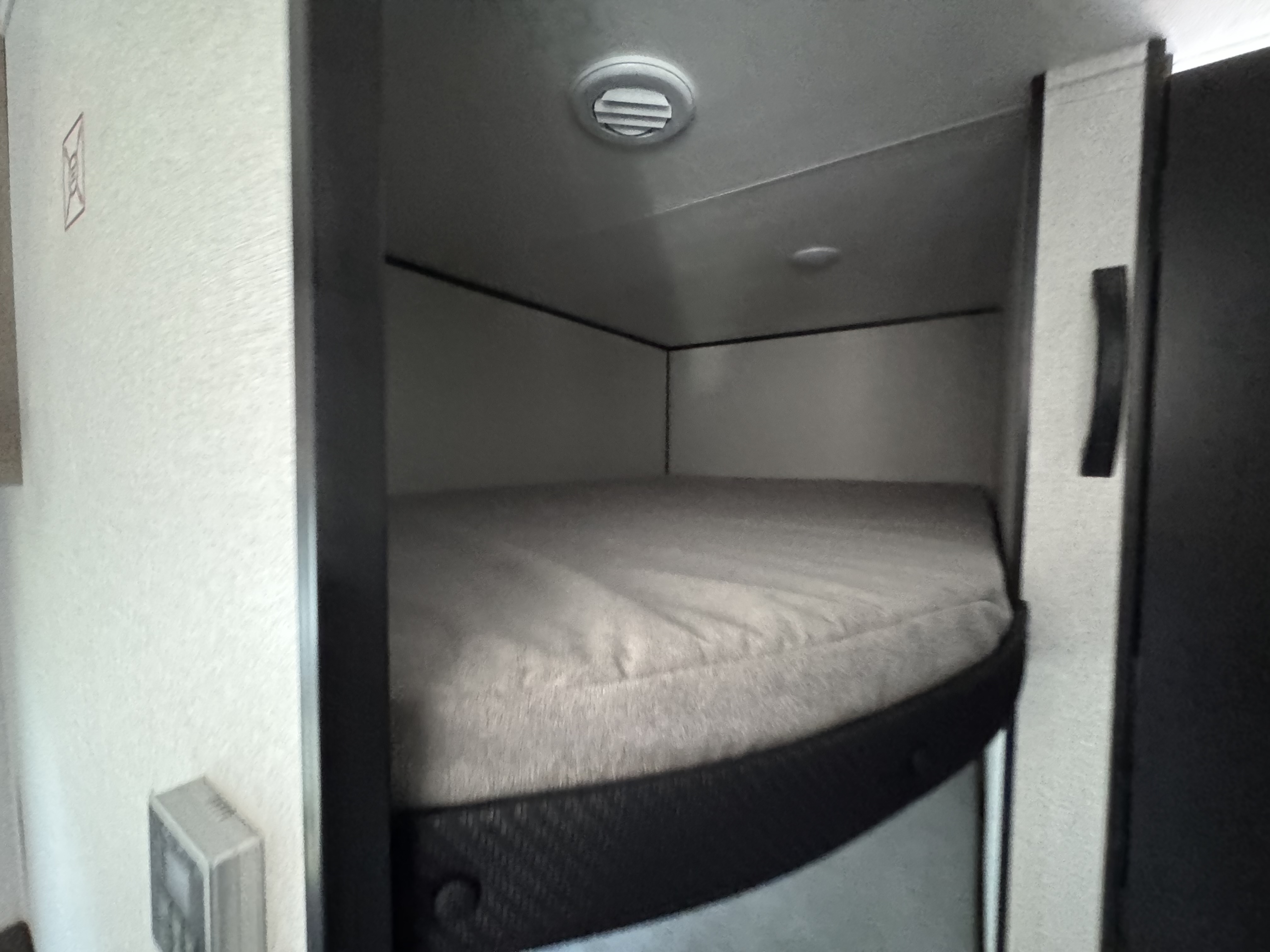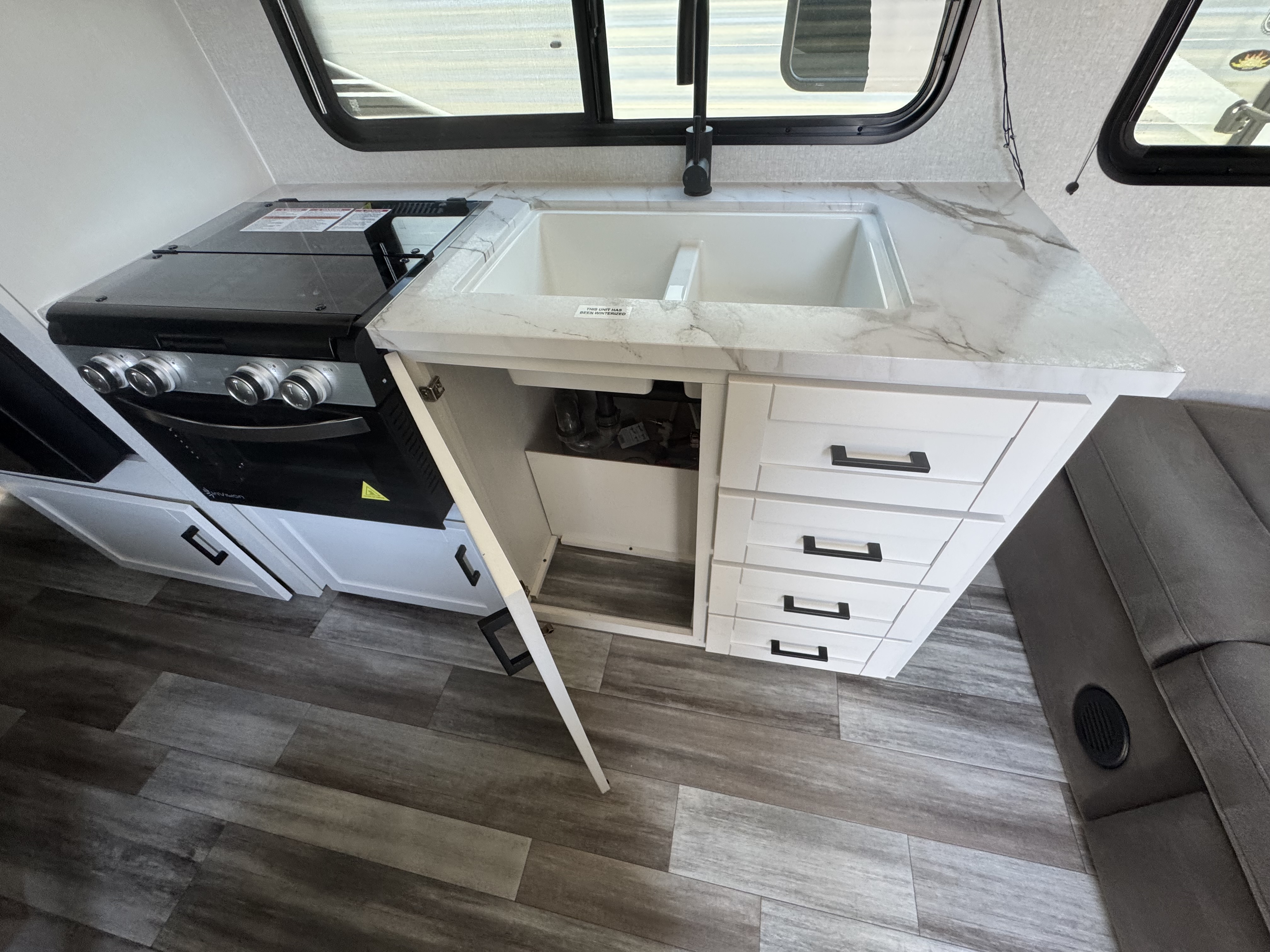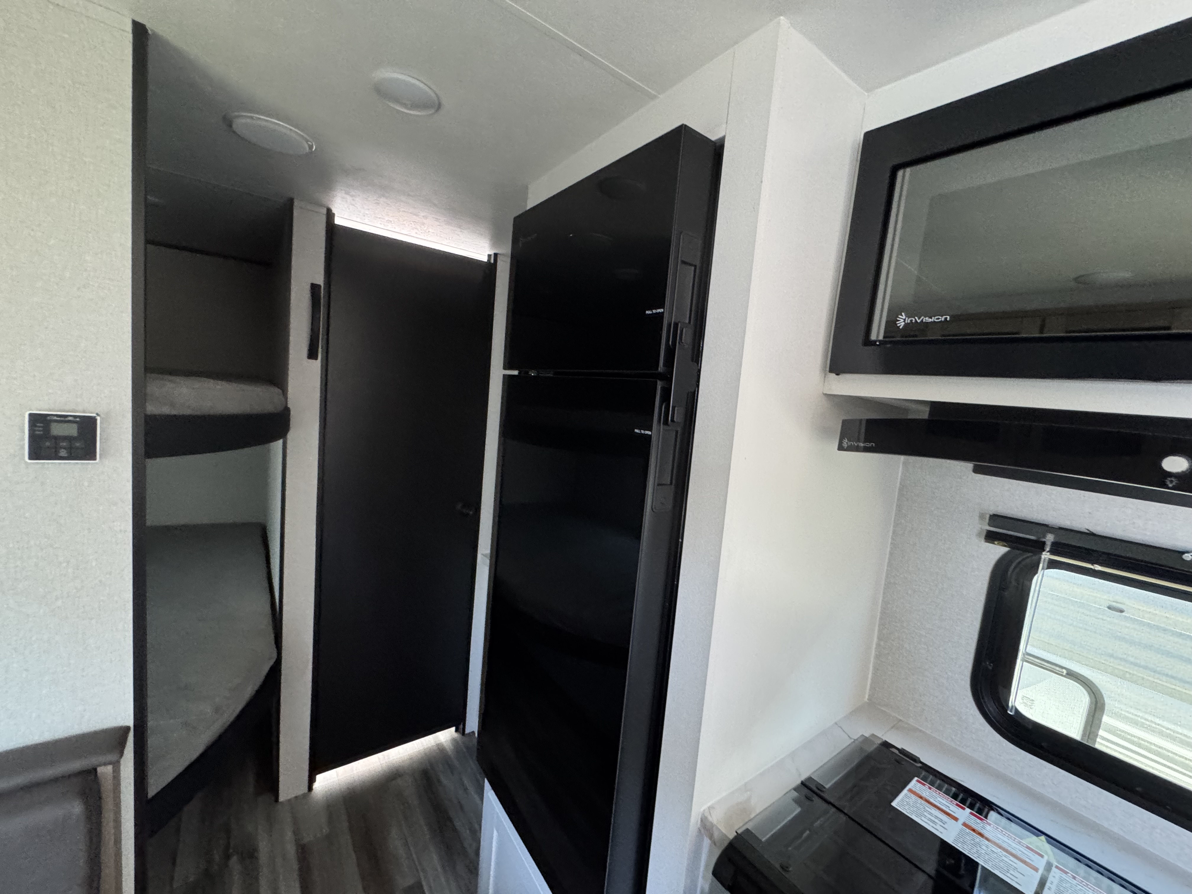 Inside, you’ll find solid hardwood cabinet doors with hidden hinges, giving the space a modern, residential feel. Oversized cabinets and under-bed storage ensure there’s room for everything you need, while the lit exterior passthrough storage makes packing and unpacking a breeze.