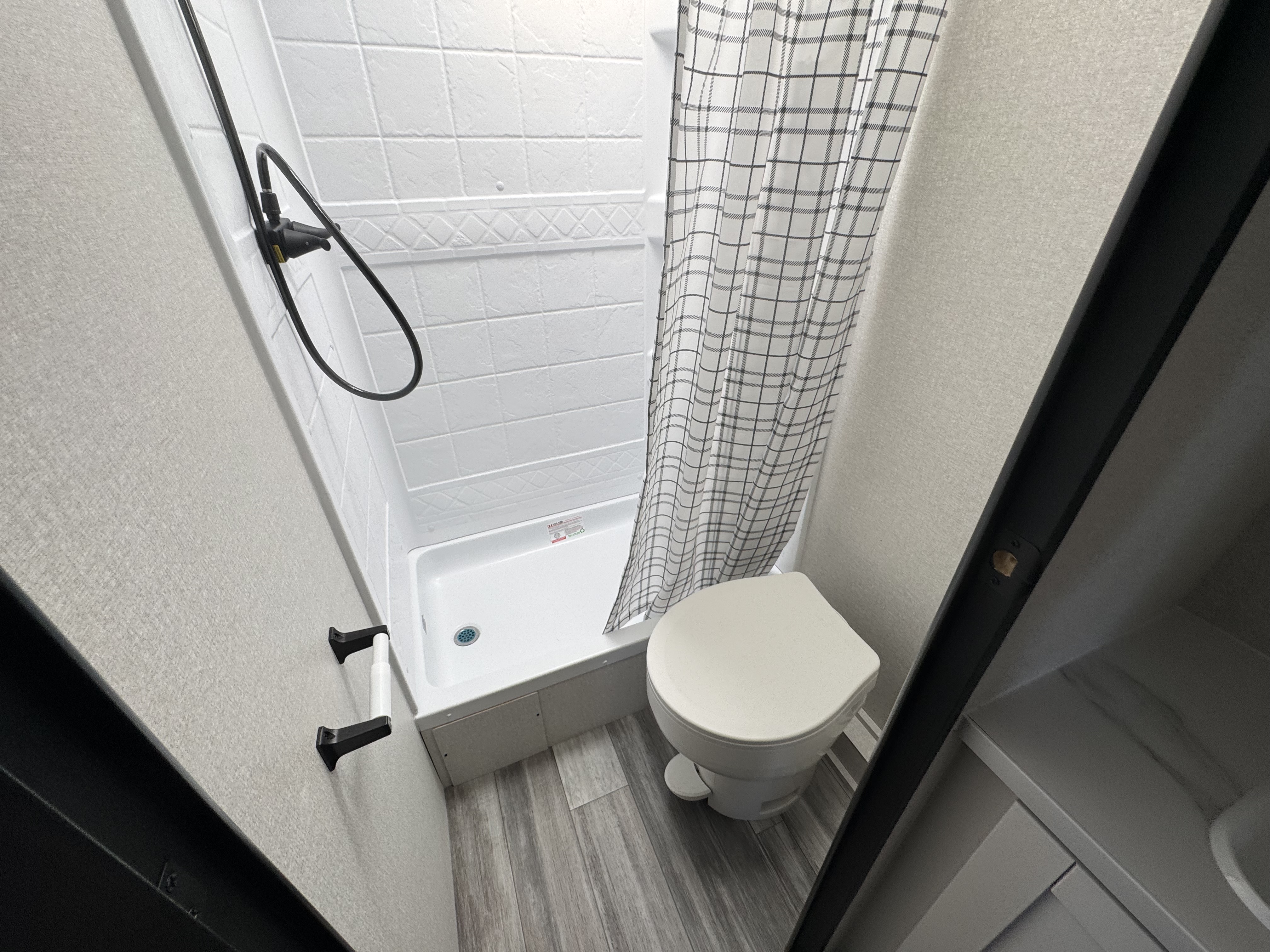- Shower curtain with curved shower track (select models)