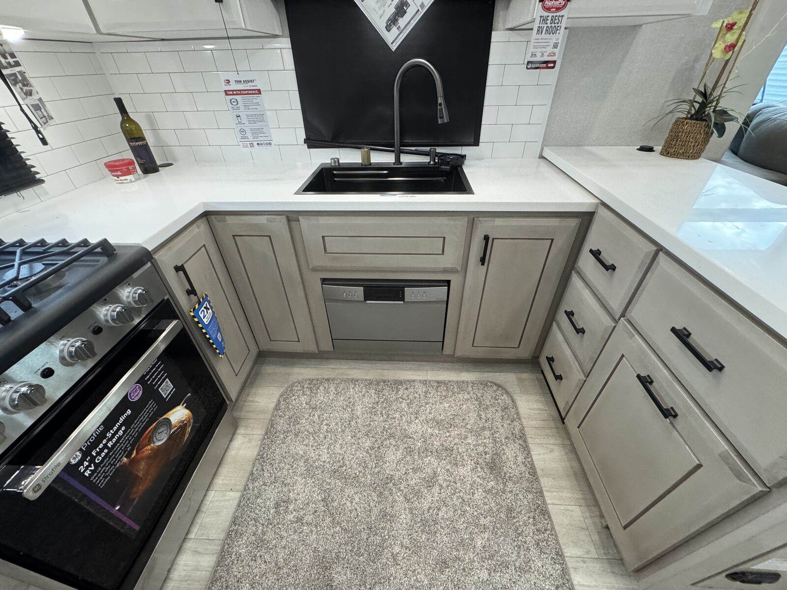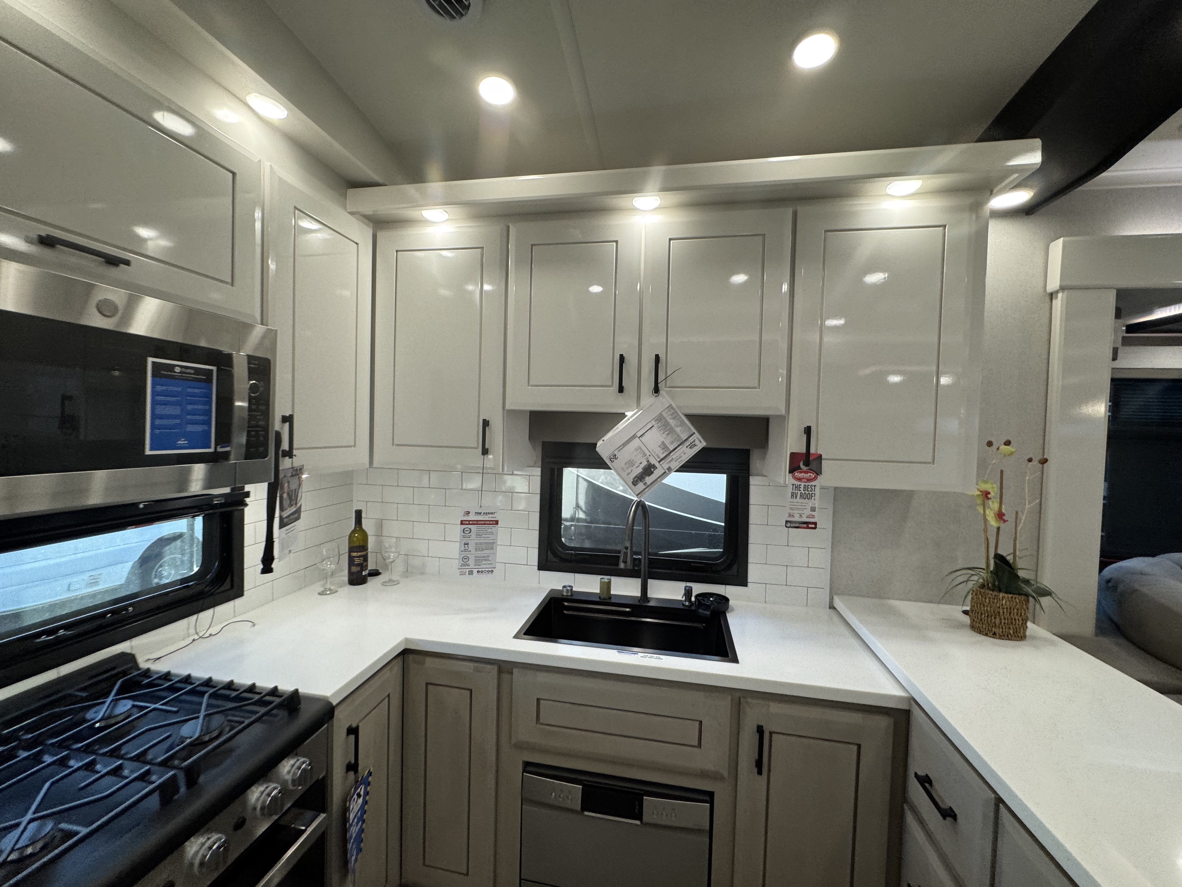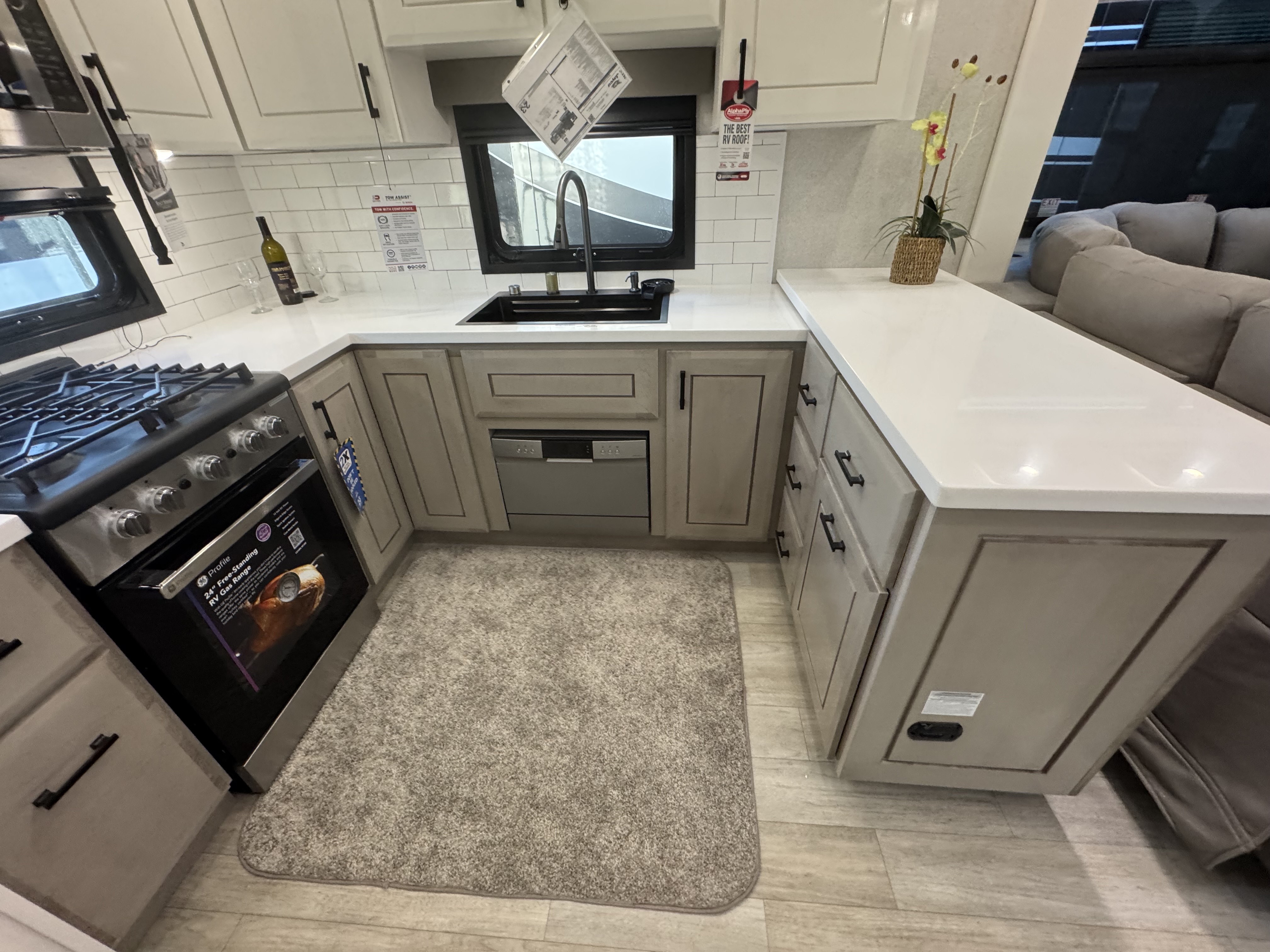 Step inside and experience the Jayco difference. From handcrafted solid hardwood maple cabinetry to sleek solid-surface countertops, every detail reflects intentional design and superior build quality. GE’s premium kitchen suite includes a 21 cu. ft. residential refrigerator, a 30 in. convection microwave with built-in air fryer, and a 24 in. high-output range—along with an available built-in dishwasher and extended bar top for effortless entertaining.