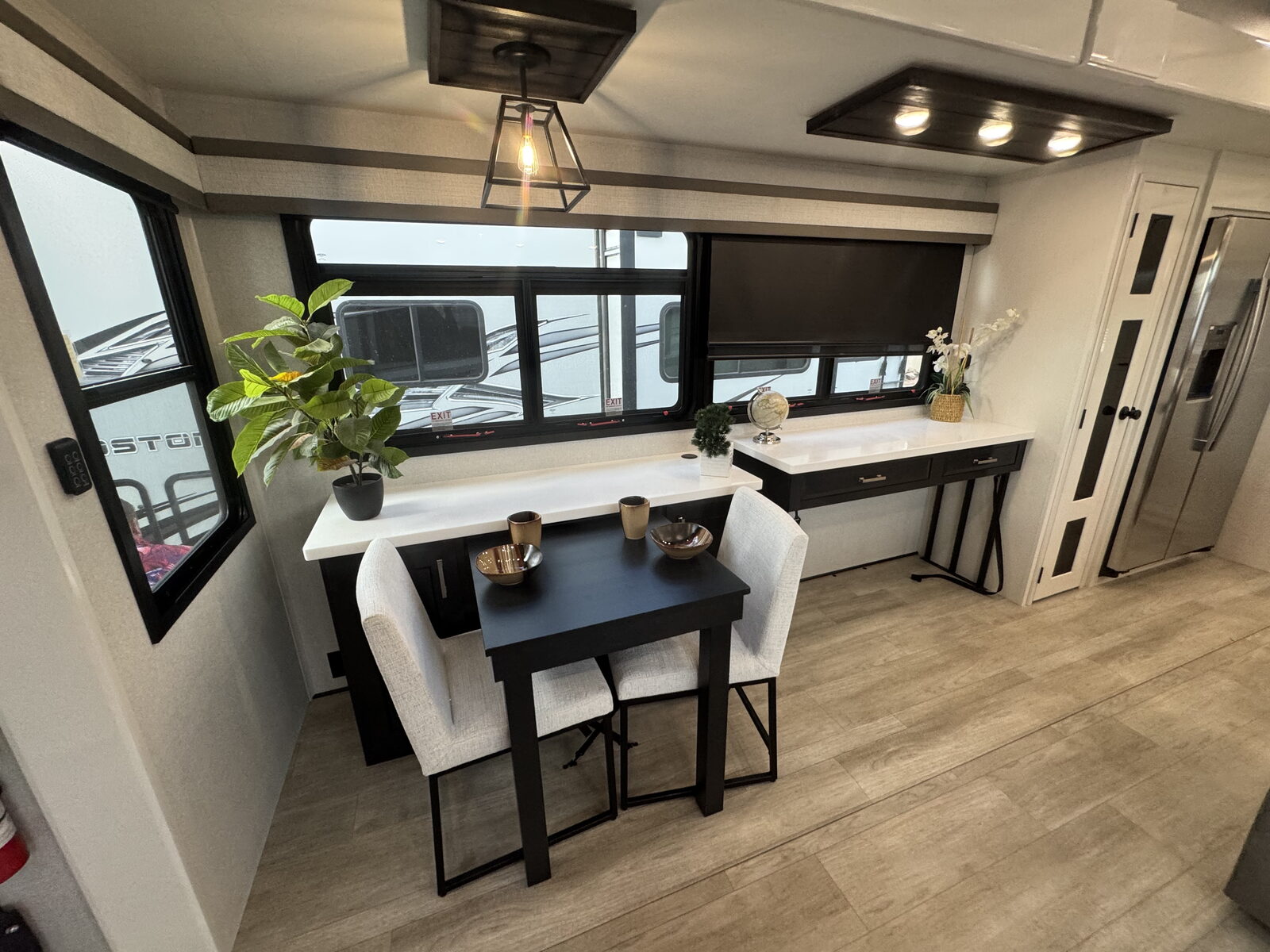 - Pull-out "Roll Top" dinette with two free-standing chairs and two folding chairs