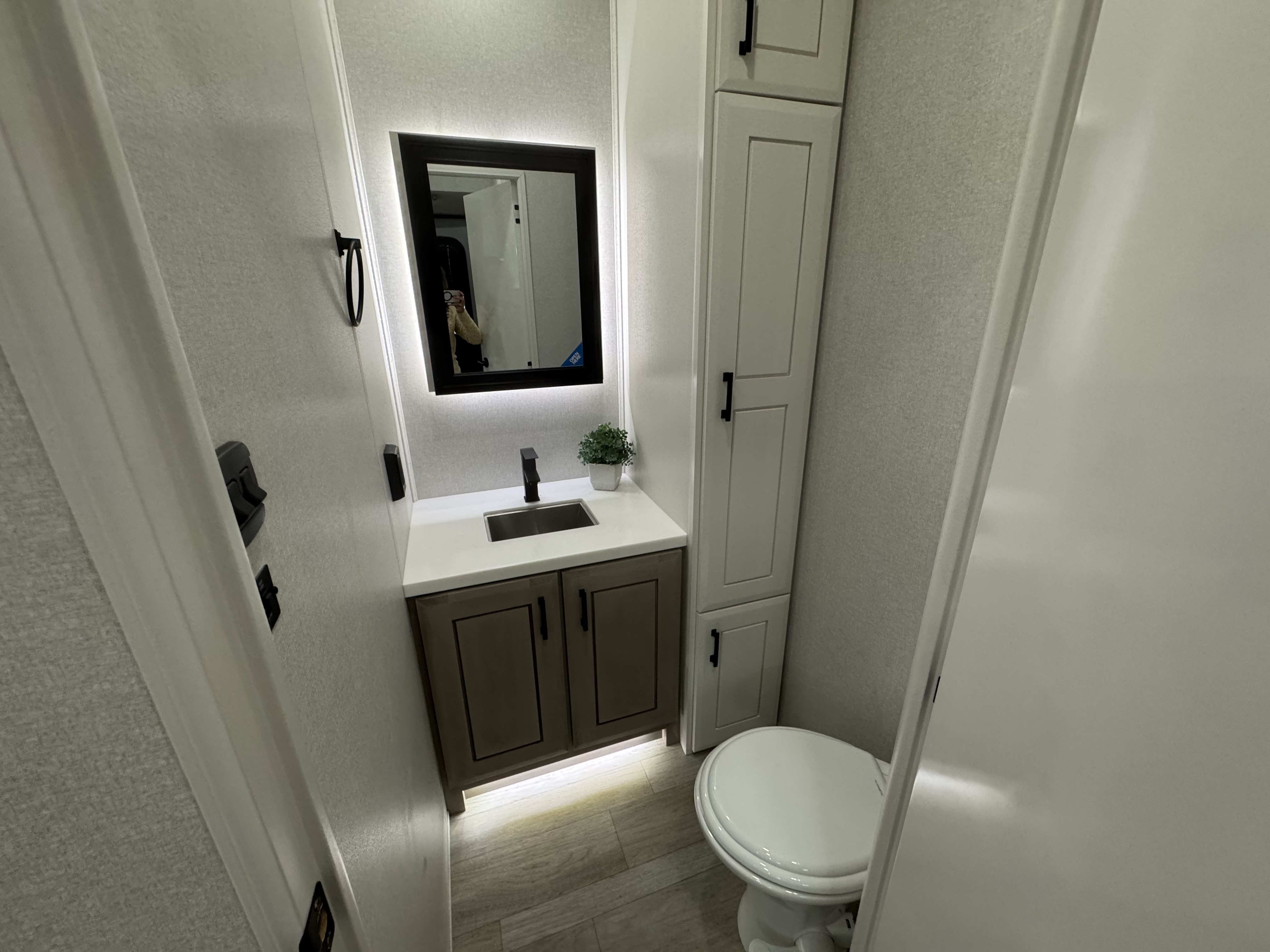 Pinnacle also features the AquaLuxe package—a premium setup that includes a high-capacity tankless water heater, (3) 40-lb. propane bottles for extended use, and the NuvoH2O filtration system. Together, they deliver instant hot water, longer off-grid capability and consistently cleaner, better-tasting water throughout the coach.
