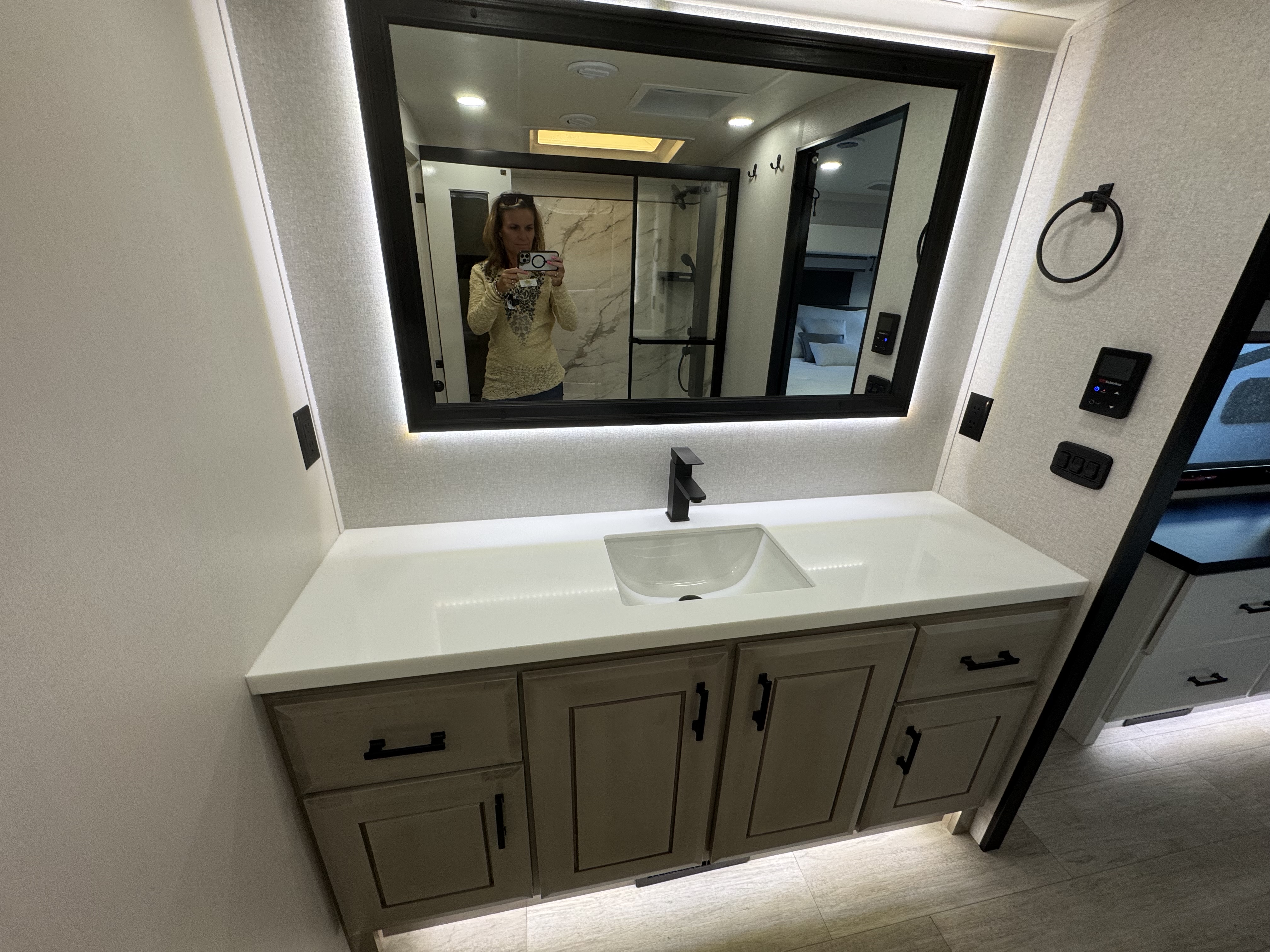 - LED backlit custom-framed mirror and medicine cabinet (most models)