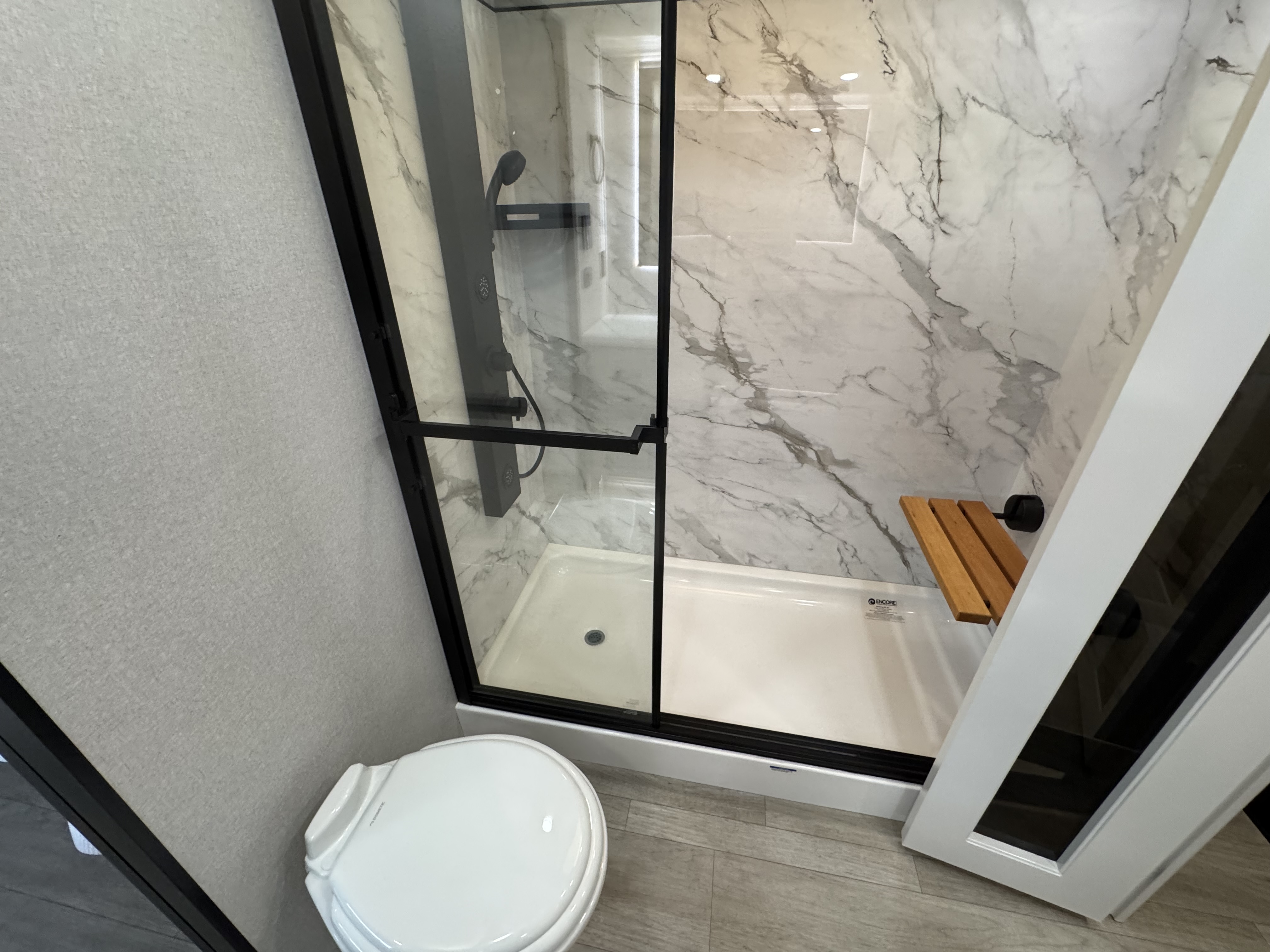 - Residential walk-in shower with teak seat