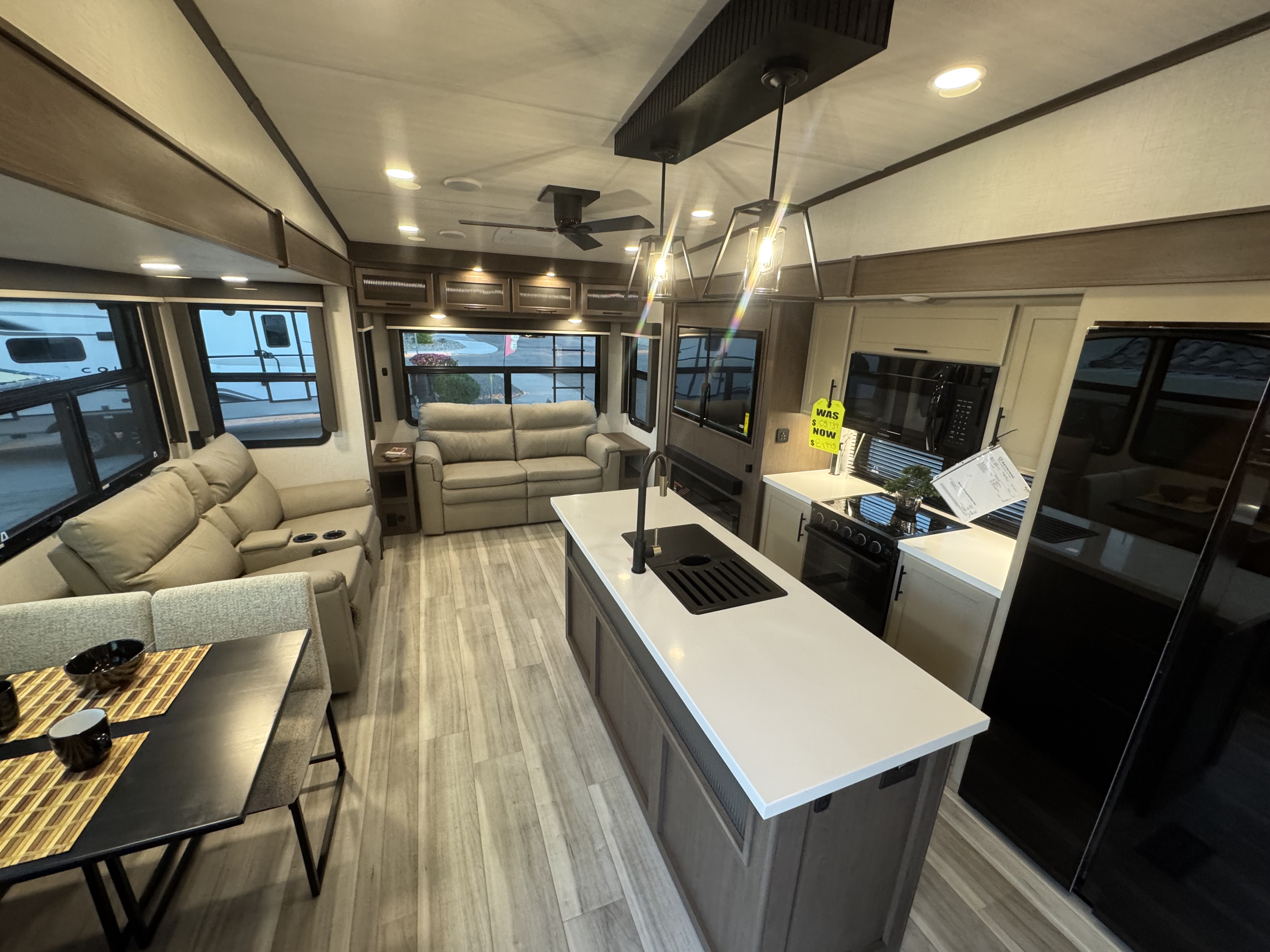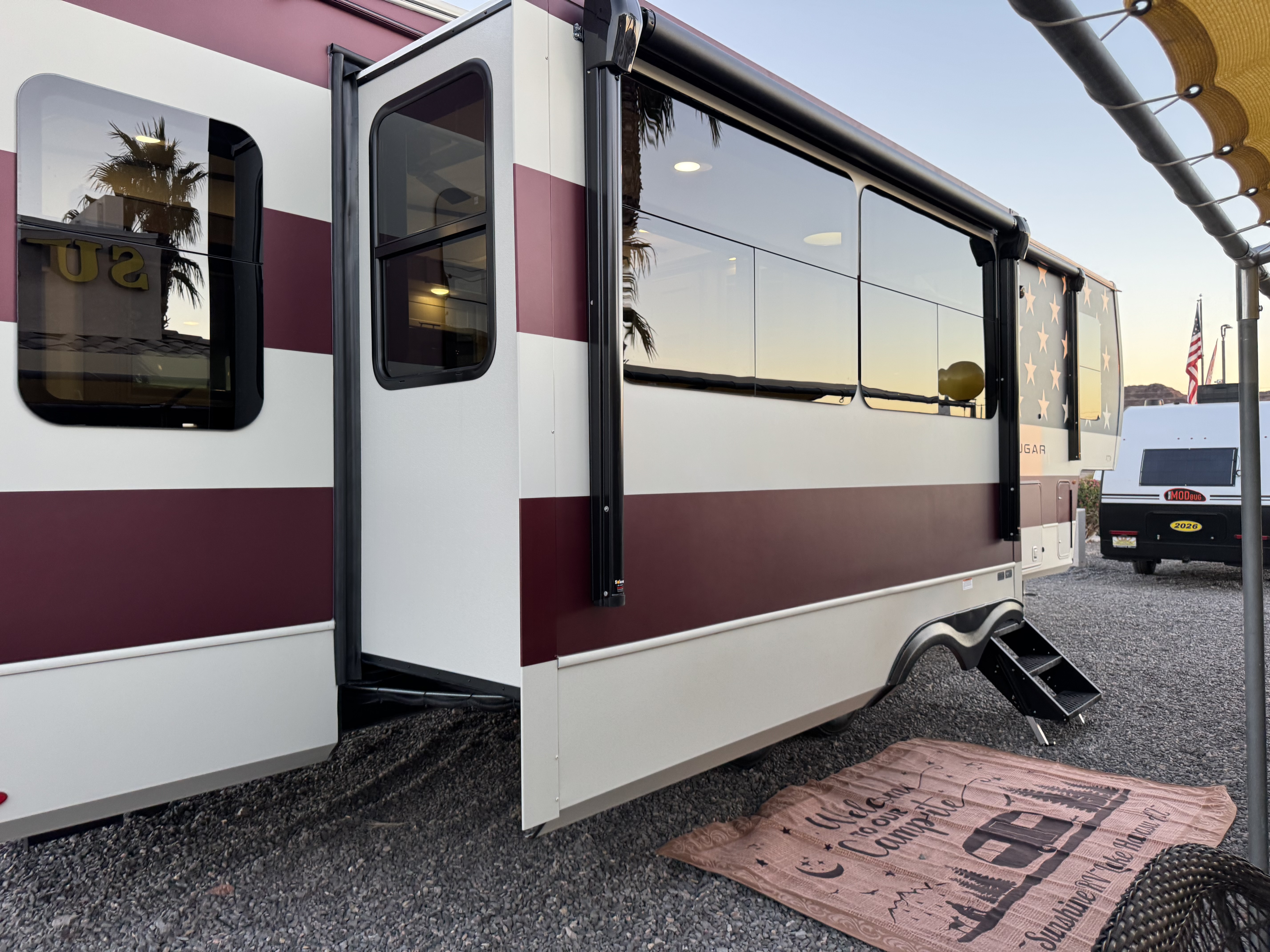 - Full pass through storage with LED light strip, power outlets and TV hookups